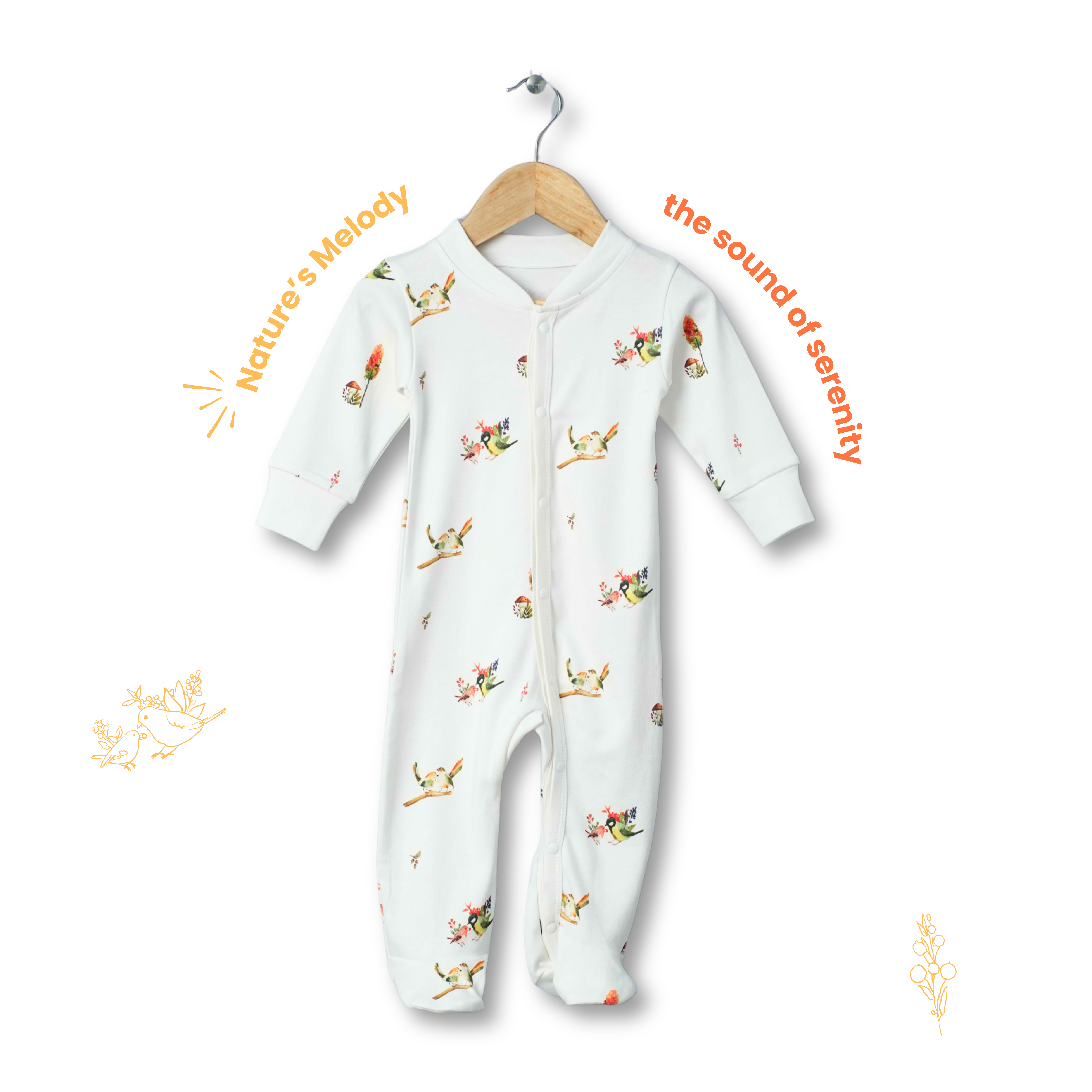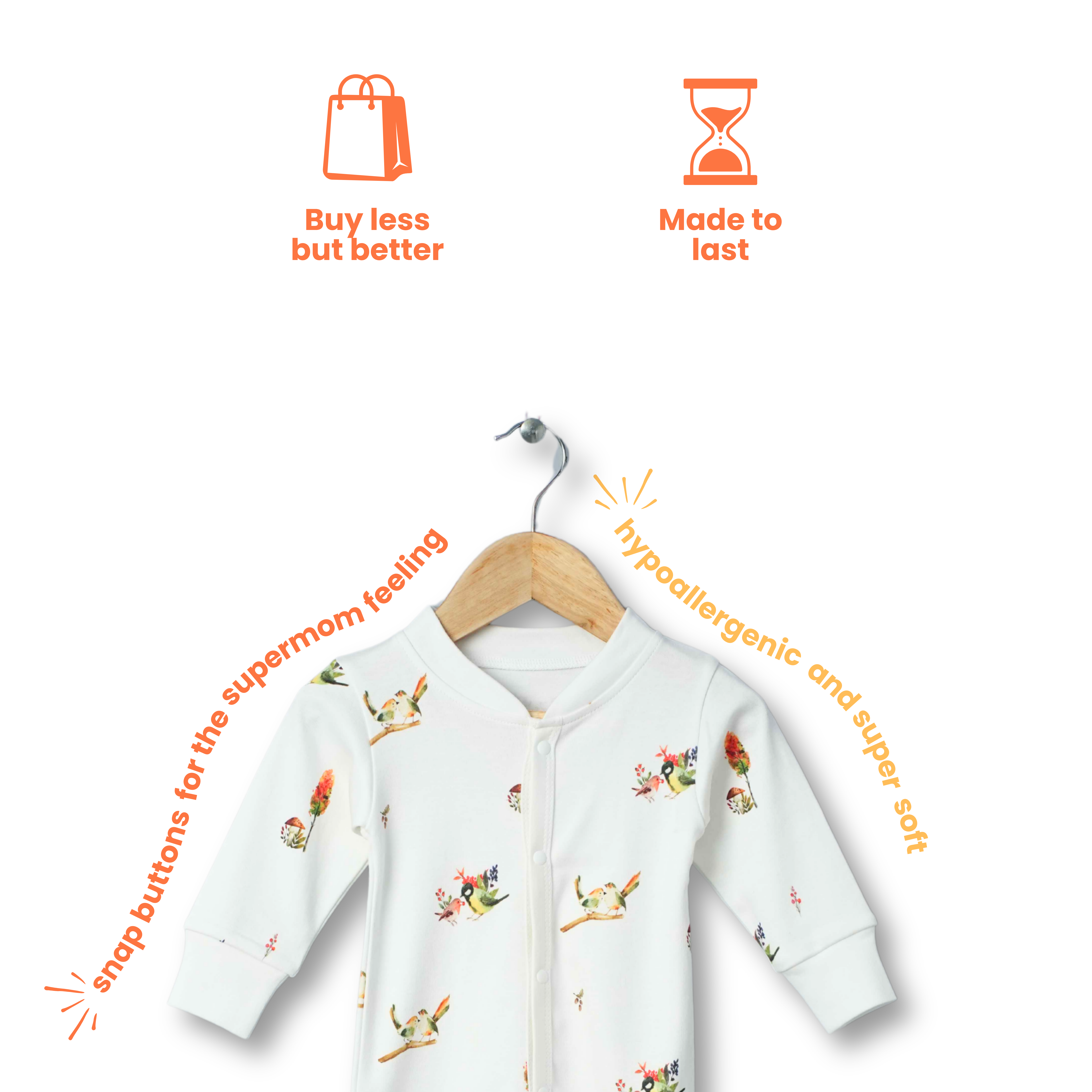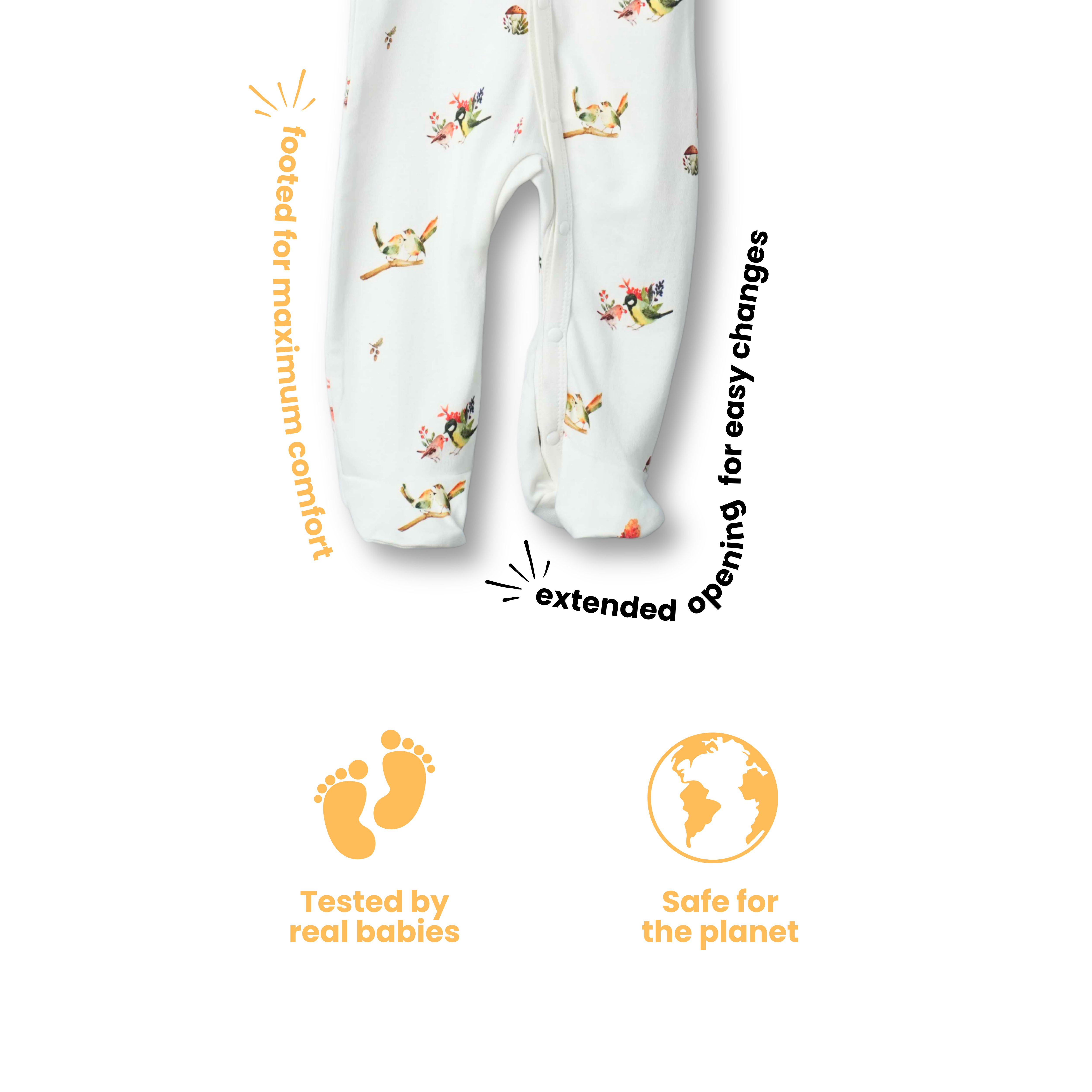 Dress your darling in our 100% organic cotton footed onesie. Easy to wear full opening style makes dressing your baby 10 times easier. More time making memories, less hassles!