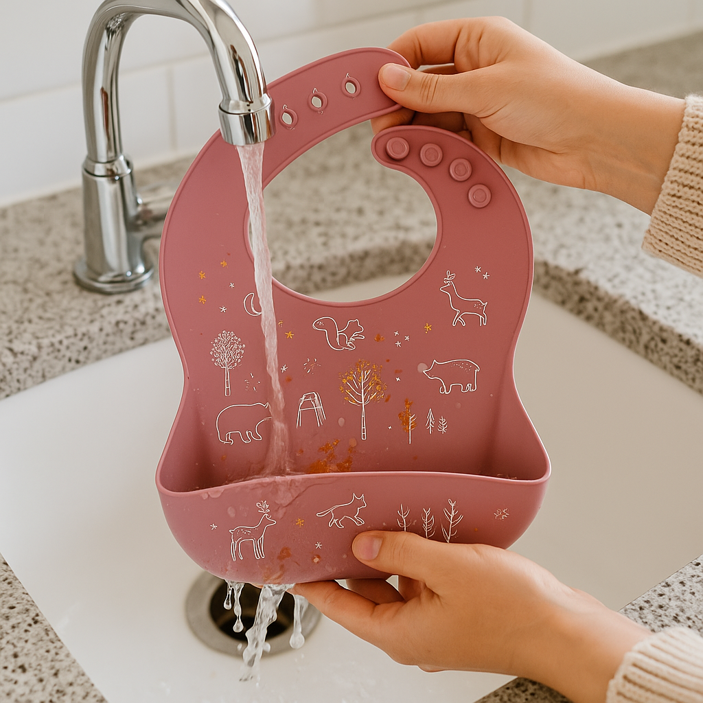 Bib with Catcher: Features a soft, adjustable up to 4 sizes neckband and a large pouch to catch spills.