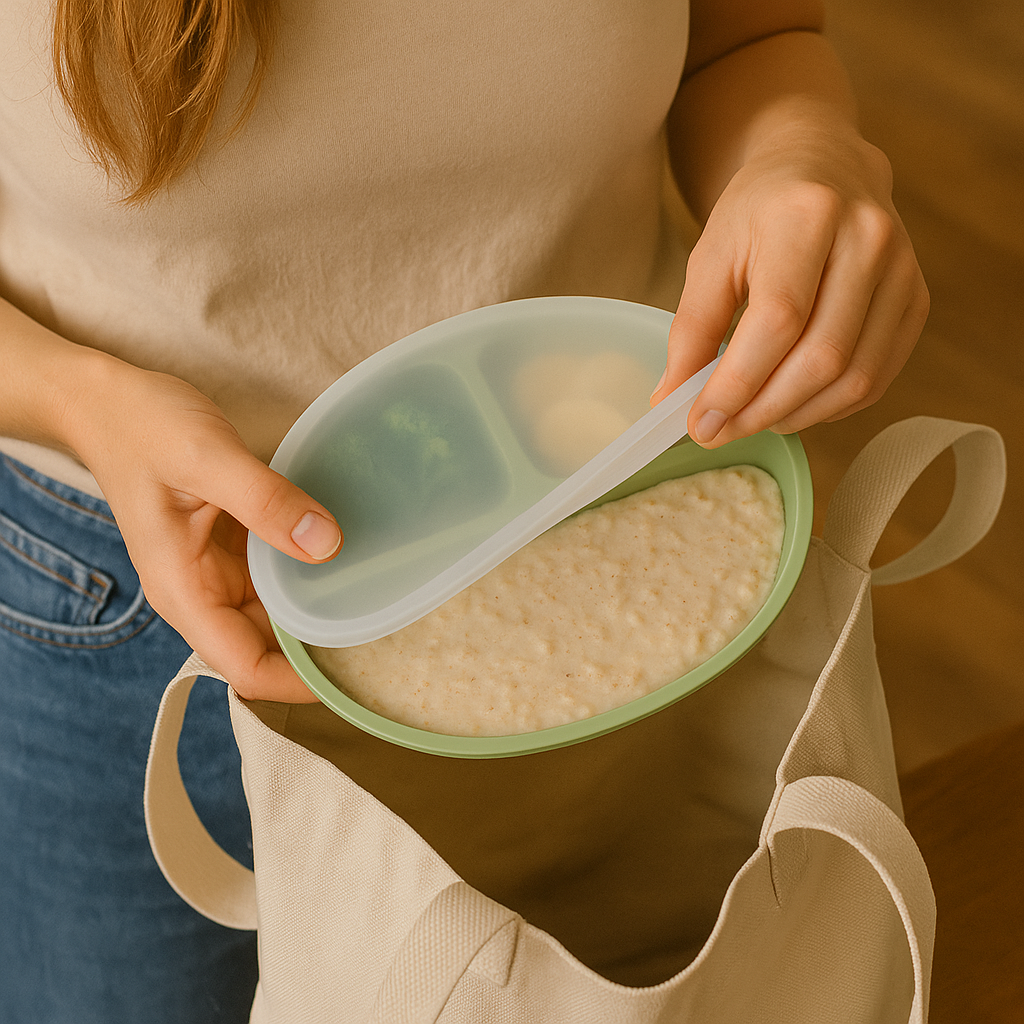 On-The-Go Plate: Sectioned plate with lid for balanced meals, with a strong suction base for mess-free mealtime.