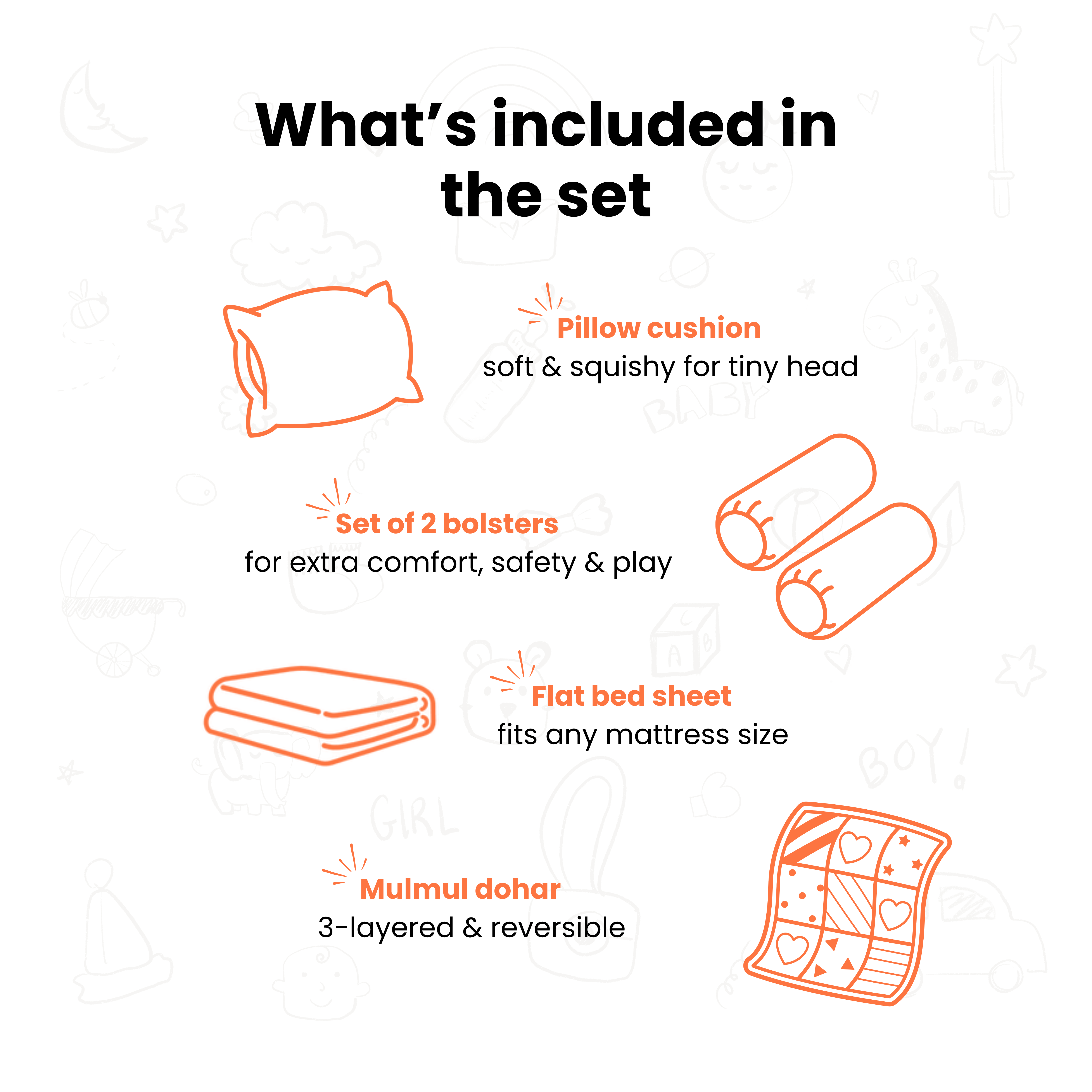 The collection contains everything you need to make your baby's nursery and cot a safe and soft snuggle space - bedsheet, pillow, bolster cushion, dohar and quilt.
