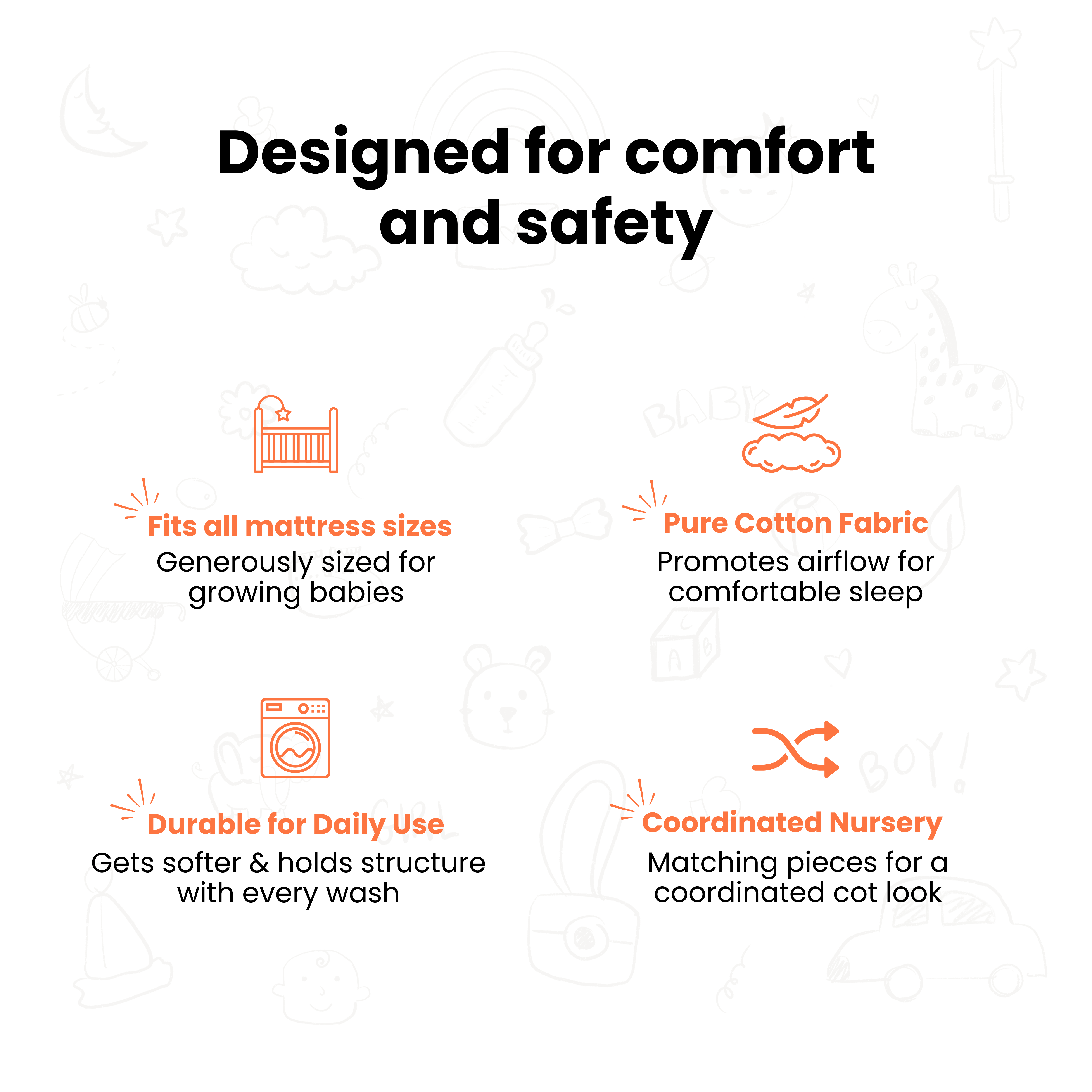 A well-coordinated cot bedding set ensures a safe, cozy, and comfortable sleep space, which is essential for a baby’s sleep quality.