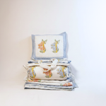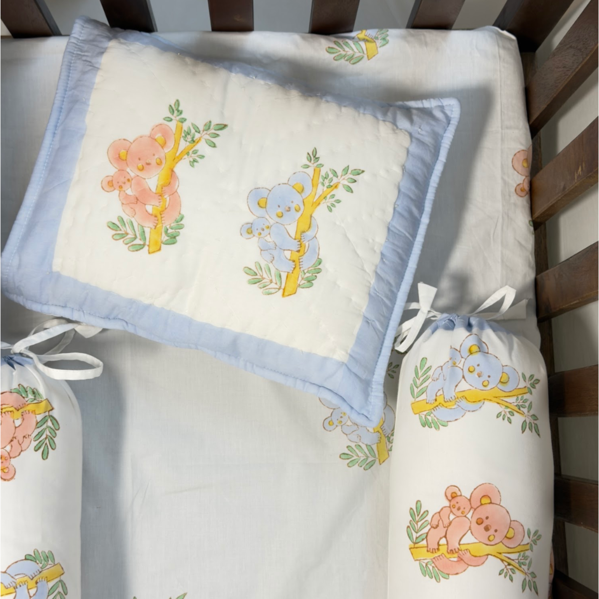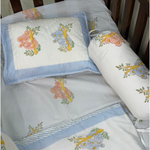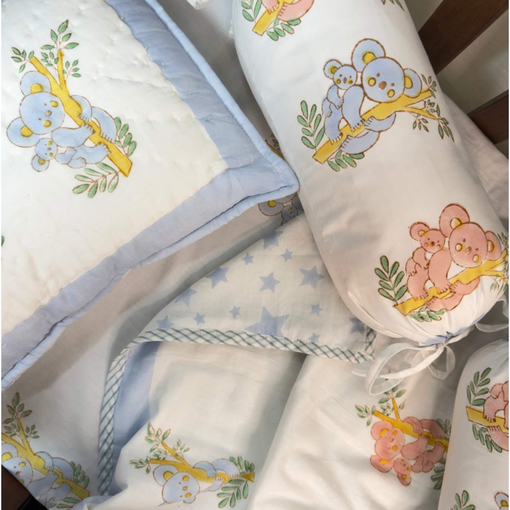 The collection contains everything you need to make your baby's nursery and cot a safe and soft snuggle space - bedsheet, pillow, bolster cushion, dohar and quilt.