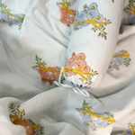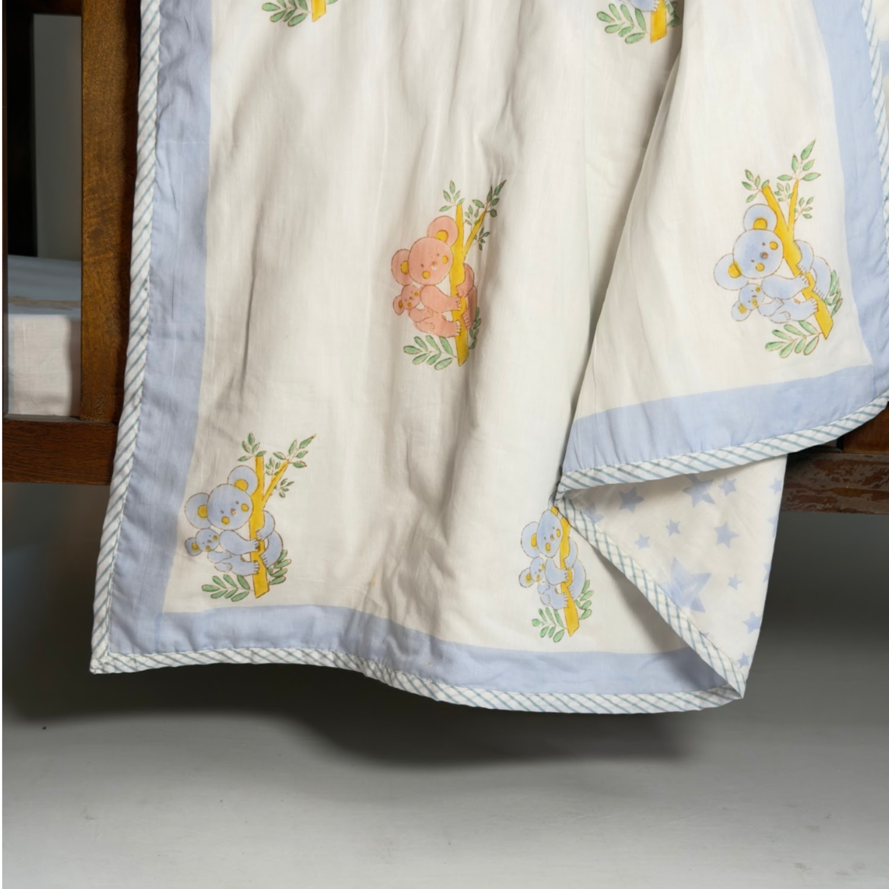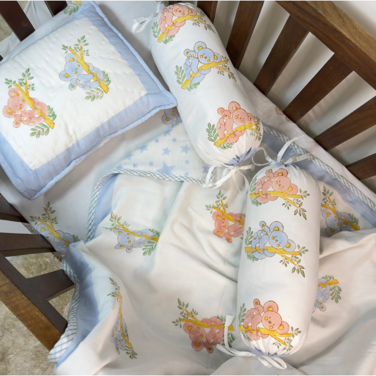 Soft, comfortable, and versatile for every season, this complete set including: sheet, pillow, 2 bolsters, and reversible dohar; makes naptime dreamy and adds the snuggles and cuddles to your little one’s cot.