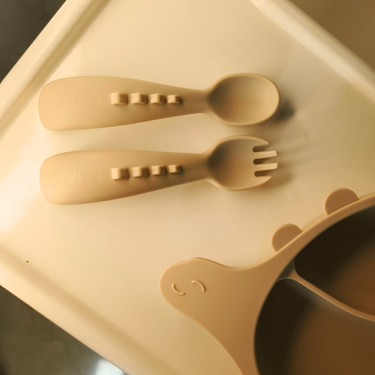• Silicone Cutlery: Designed ergonomically for little hands.