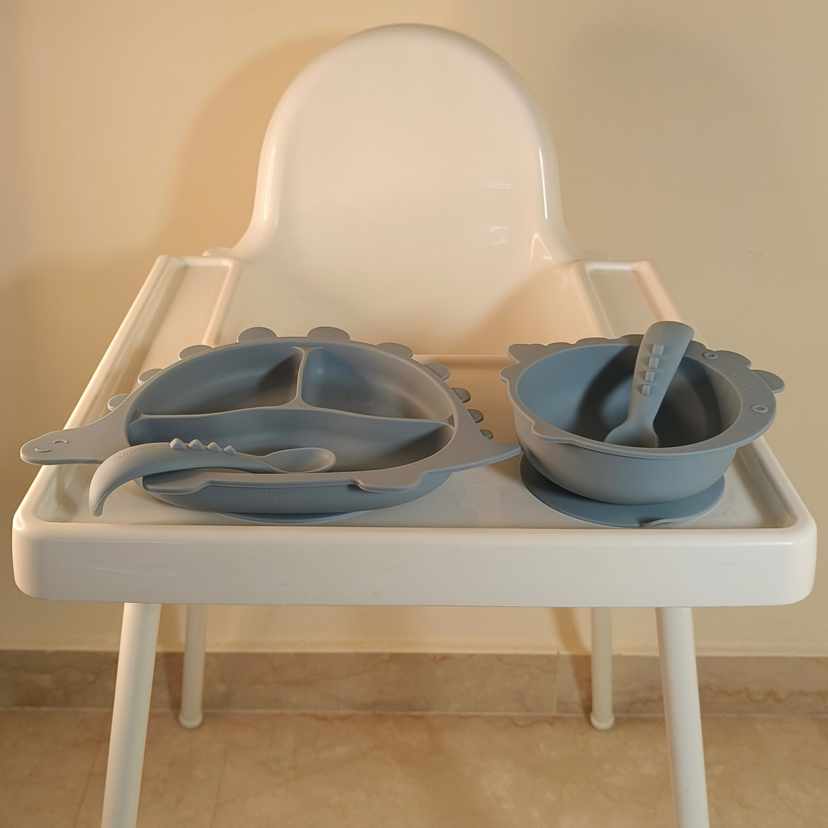 Silicone feeding tableware or any suitable tableware can be used once the baby starts showing signs for BLW. It is usually used at around 5-6 months, on advice of a paediatrician.