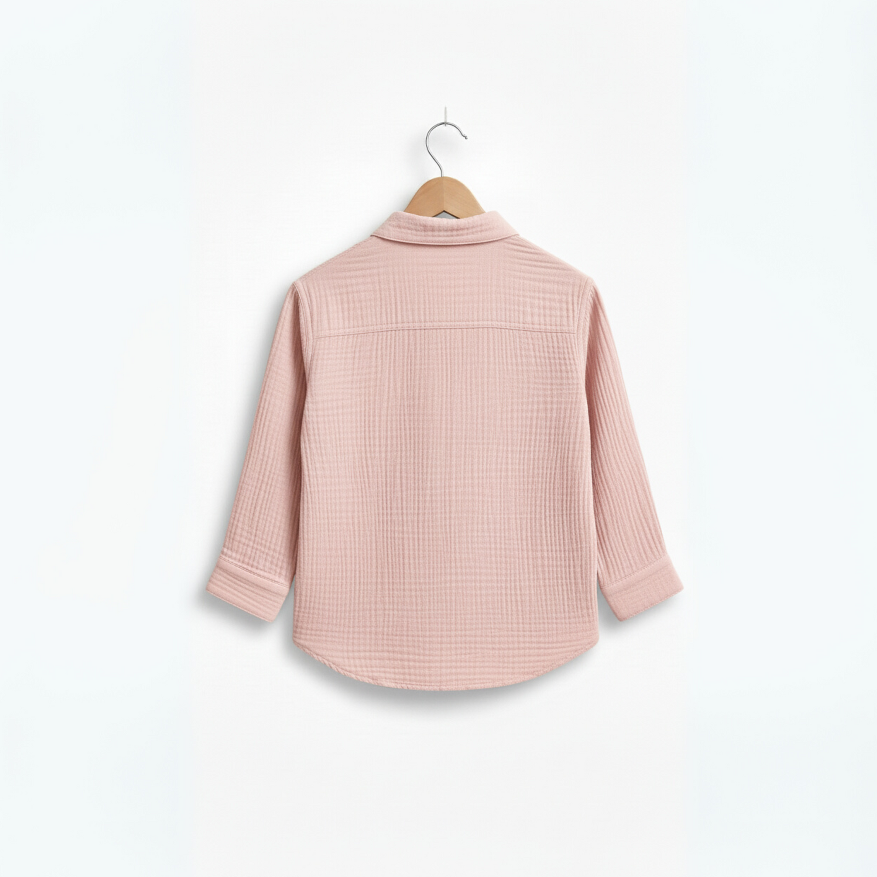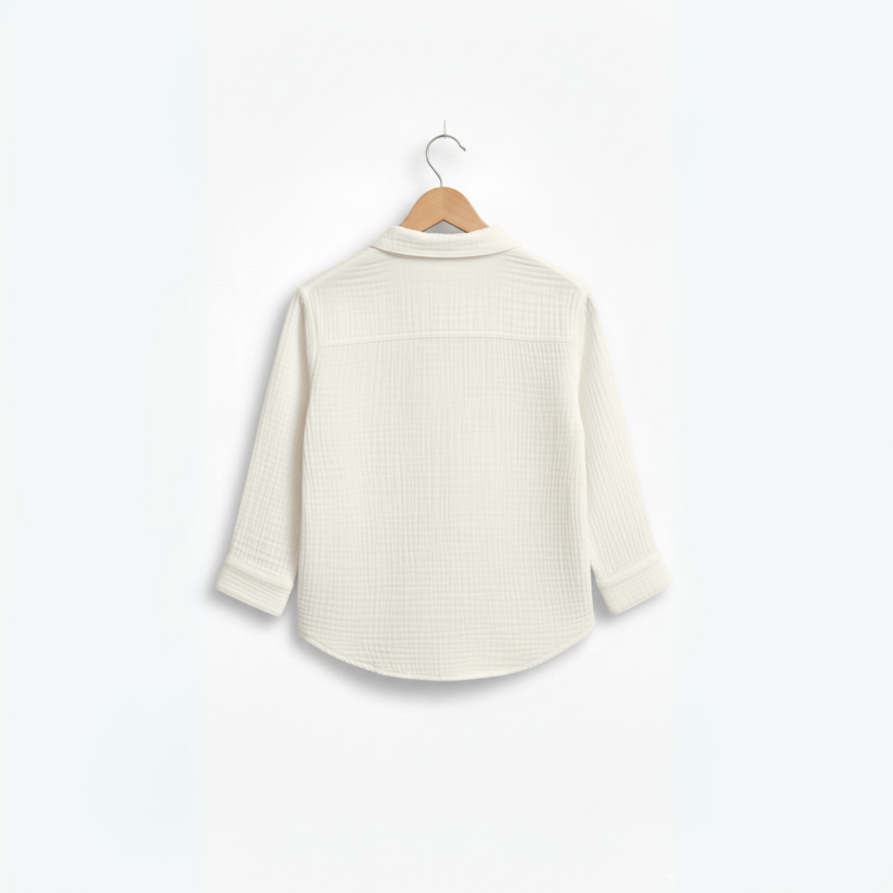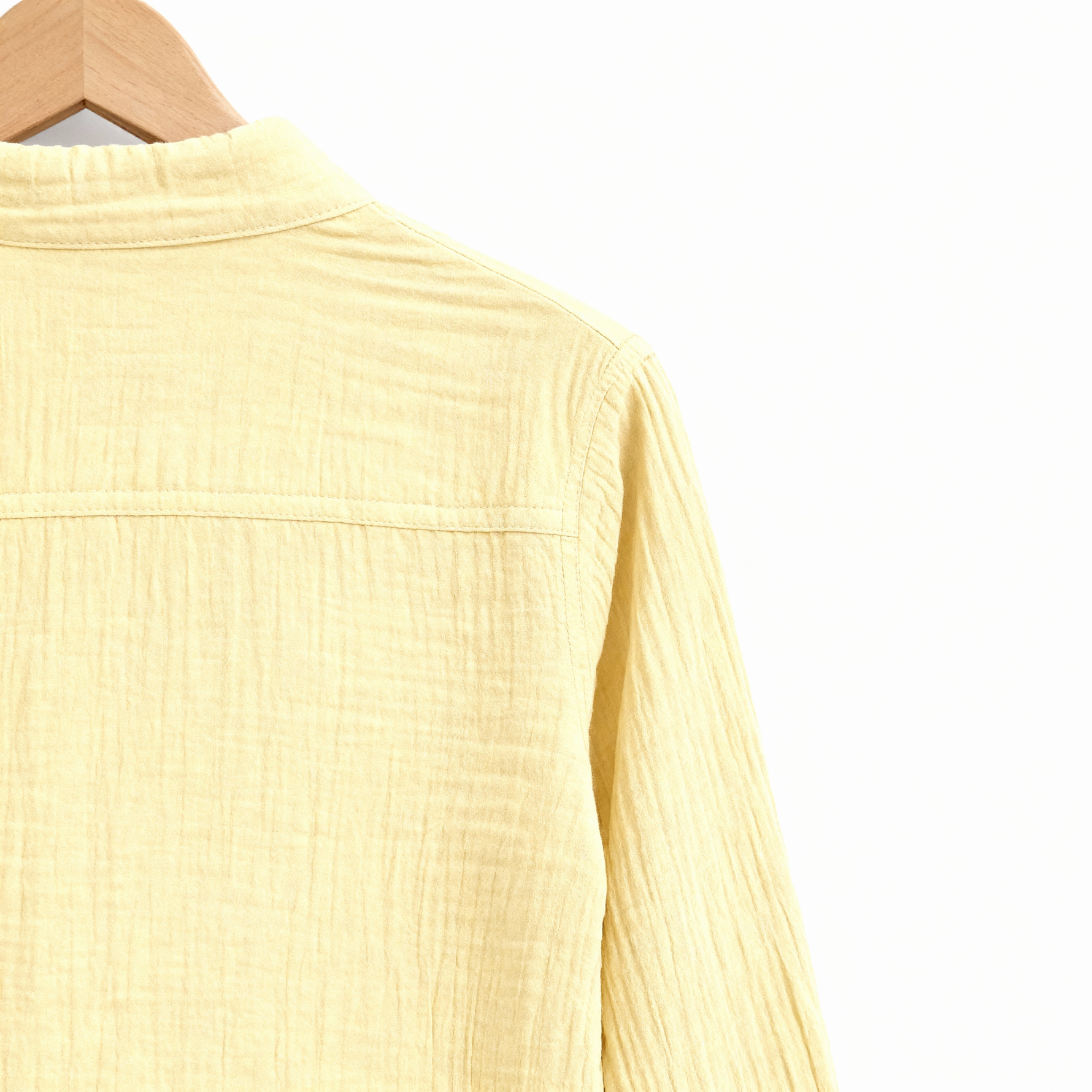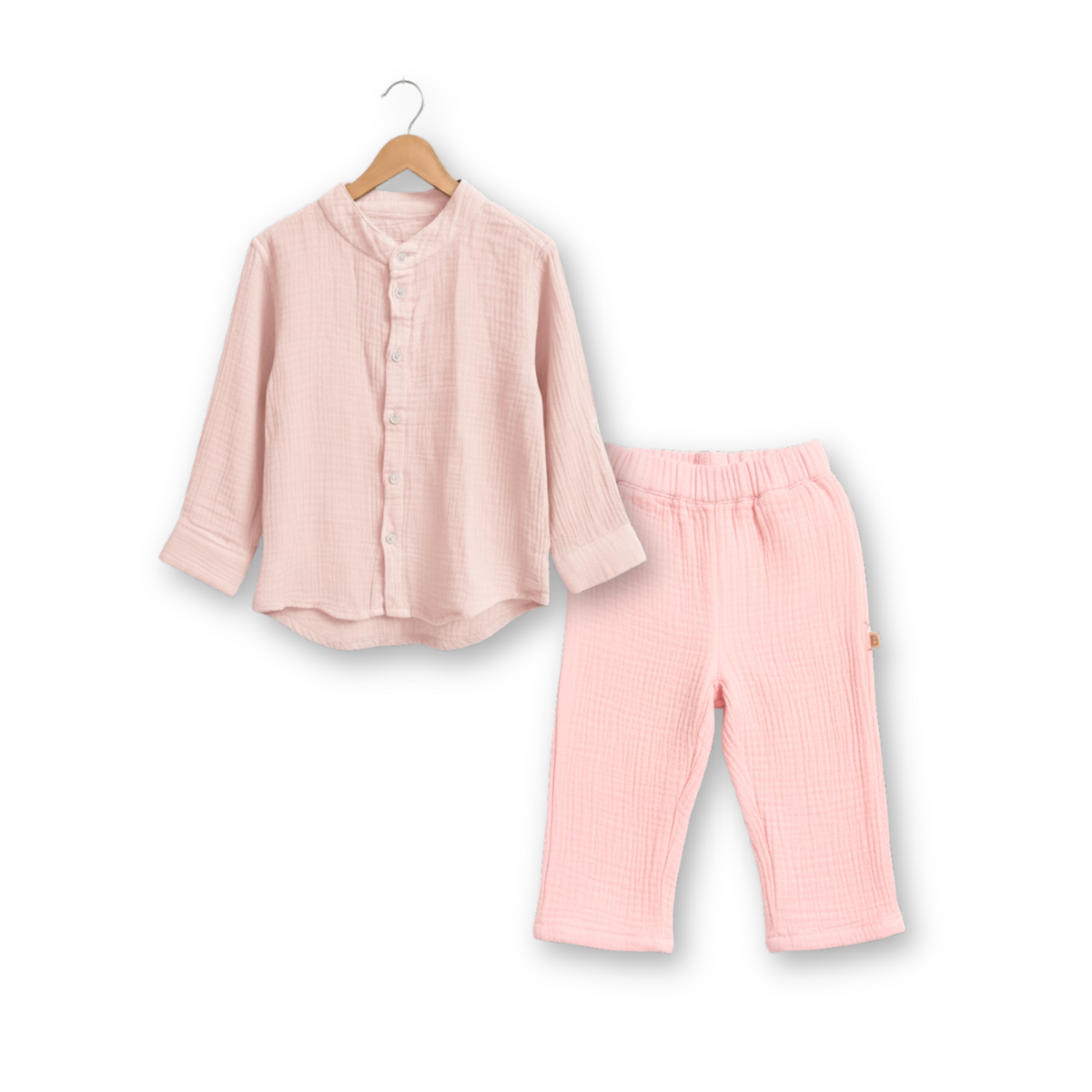 Long-sleeved classic unisex shirt in soft cotton muslin with a mandarin collar and front button placket - paired with - comfort unisex pants in soft cotton muslin, regular fit with straight cut, elasticated waist, tailored side pockets and patch pocket at back.