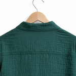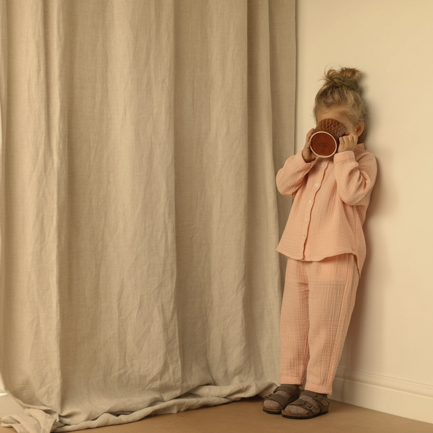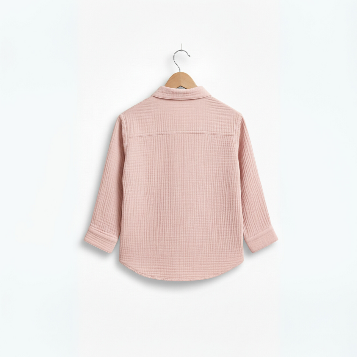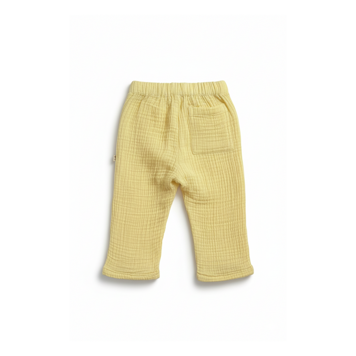 Long-sleeved classic unisex shirt in soft cotton muslin with a mandarin collar and front button placket - paired with - comfort unisex pants in soft cotton muslin, regular fit with straight cut, elasticated waist, tailored side pockets and patch pocket at back.