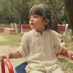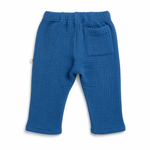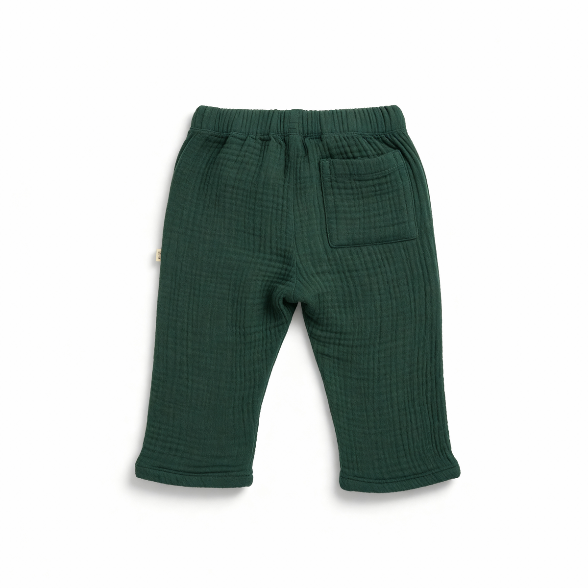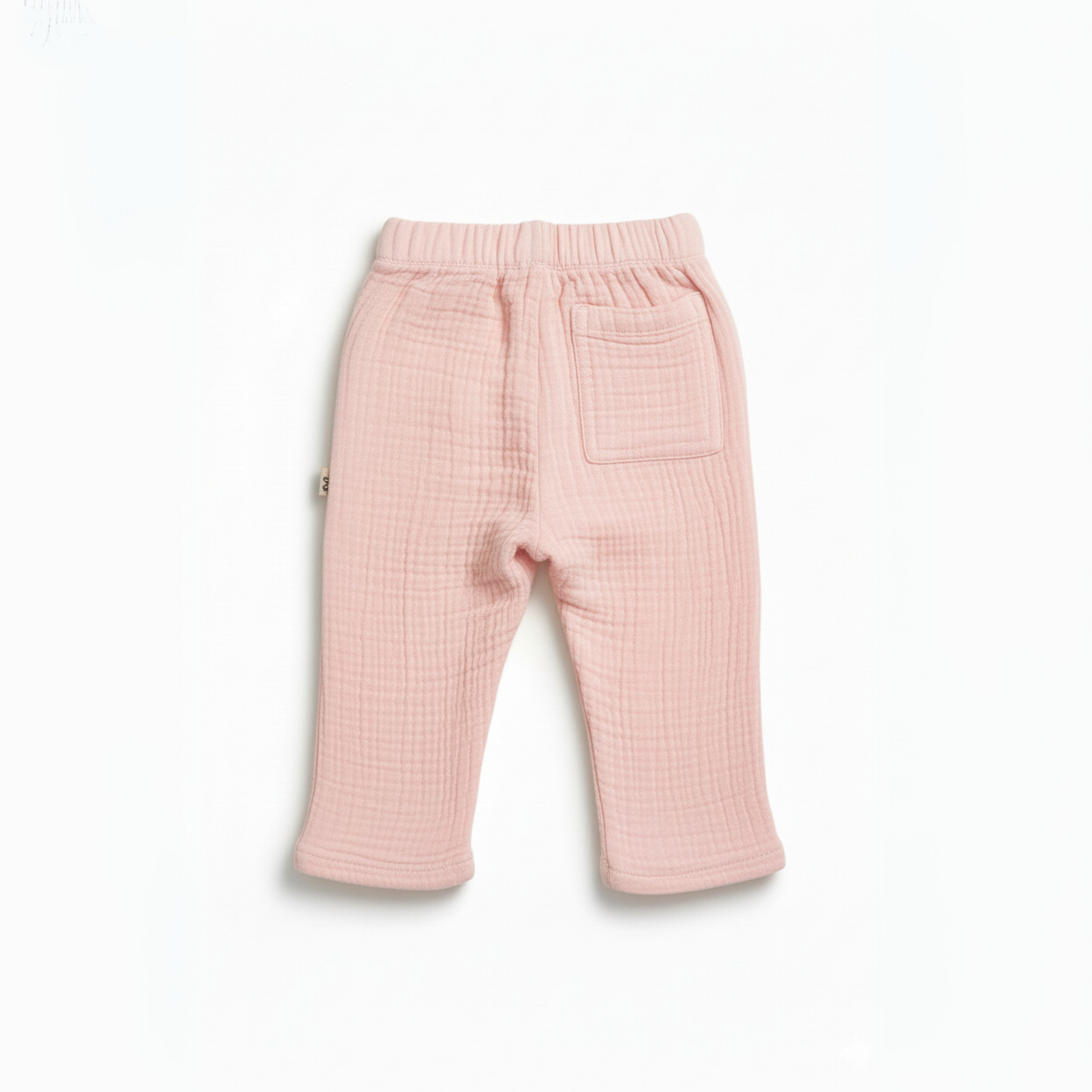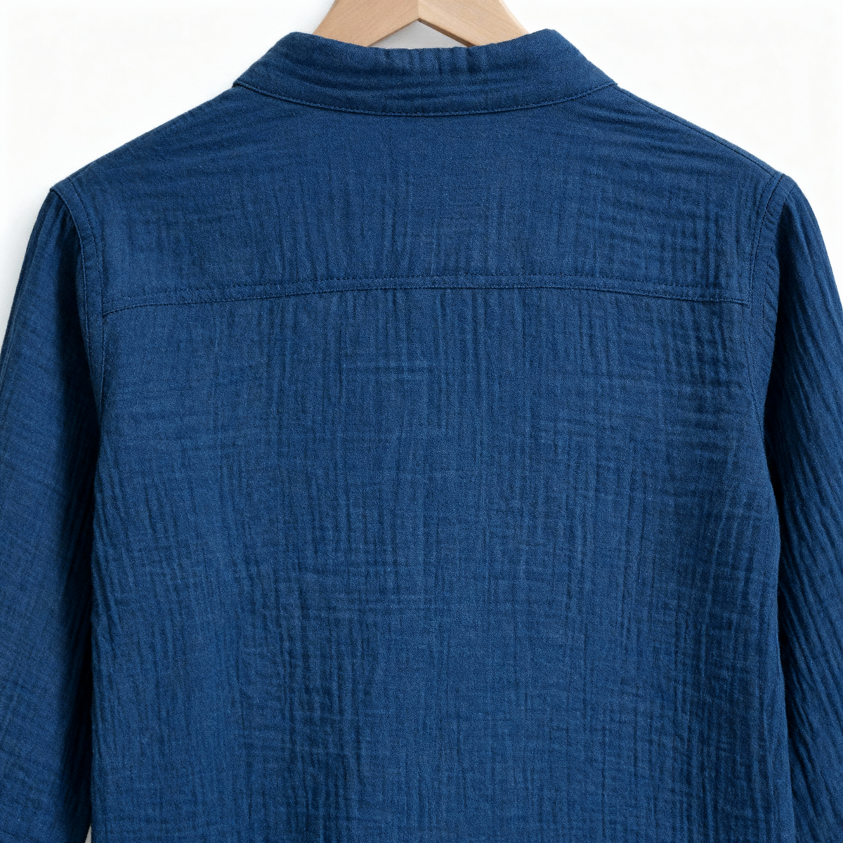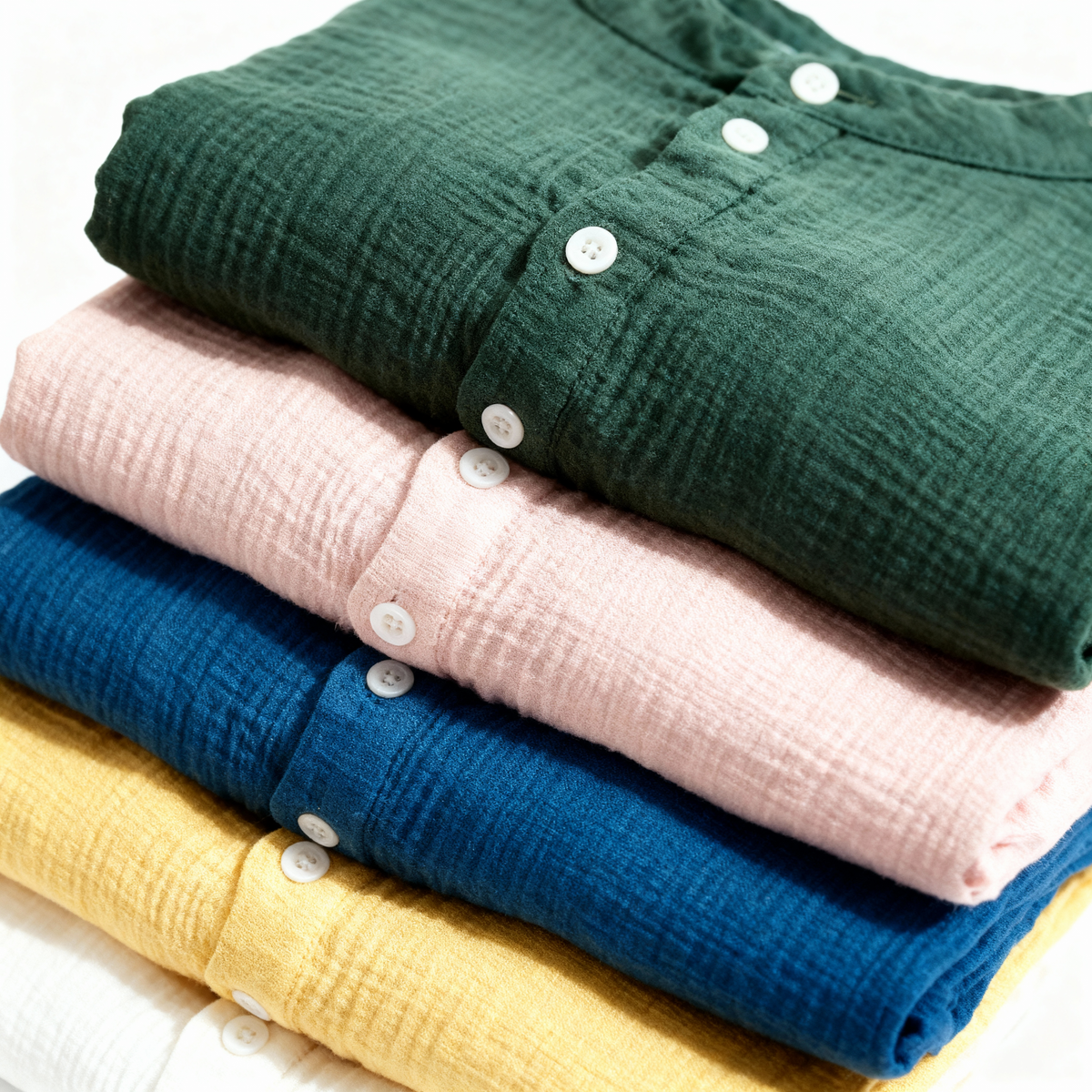 Long-sleeved classic unisex shirt in soft cotton muslin with a mandarin collar and front button placket - paired with - comfort unisex pants in soft cotton muslin, regular fit with straight cut, elasticated waist, tailored side pockets and patch pocket at back.