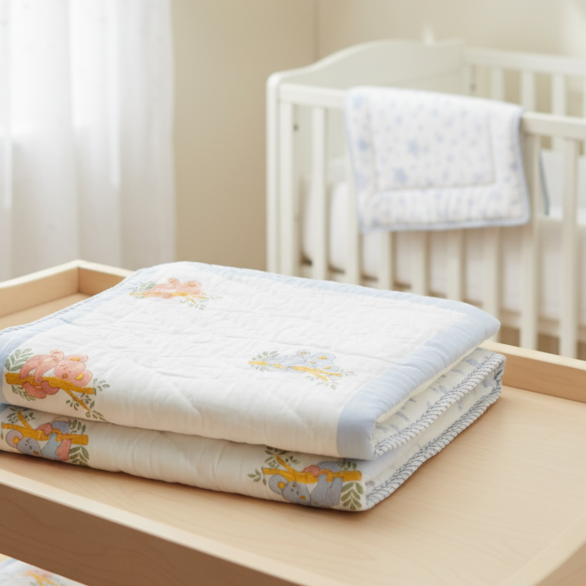 Create a nursery that’s as cozy as it is comforting with the Koala bedding set. Soft, comfortable, and versatile for every season, this complete set — including sheet, pillow, 2 bolsters, and reversible quilt — makes naptime dreamy and adds the snuggles and cuddles to your little one’s cot. The entire collection is hand block printed and made by local artisans in Jaipur to add the culture touch.