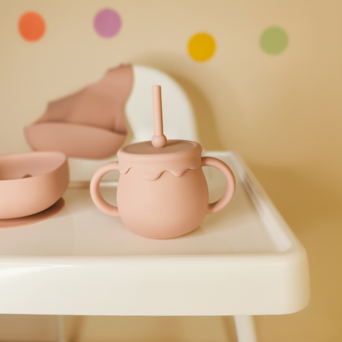 - Sippy Cup: 4-in-1 design grows from snack to sippy to straw to open as the self feeding grows.