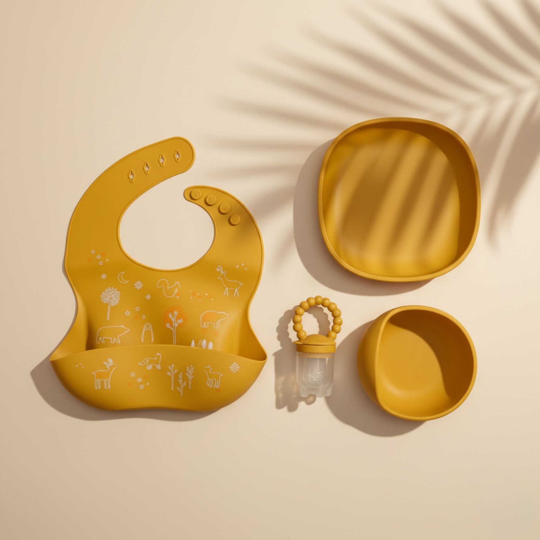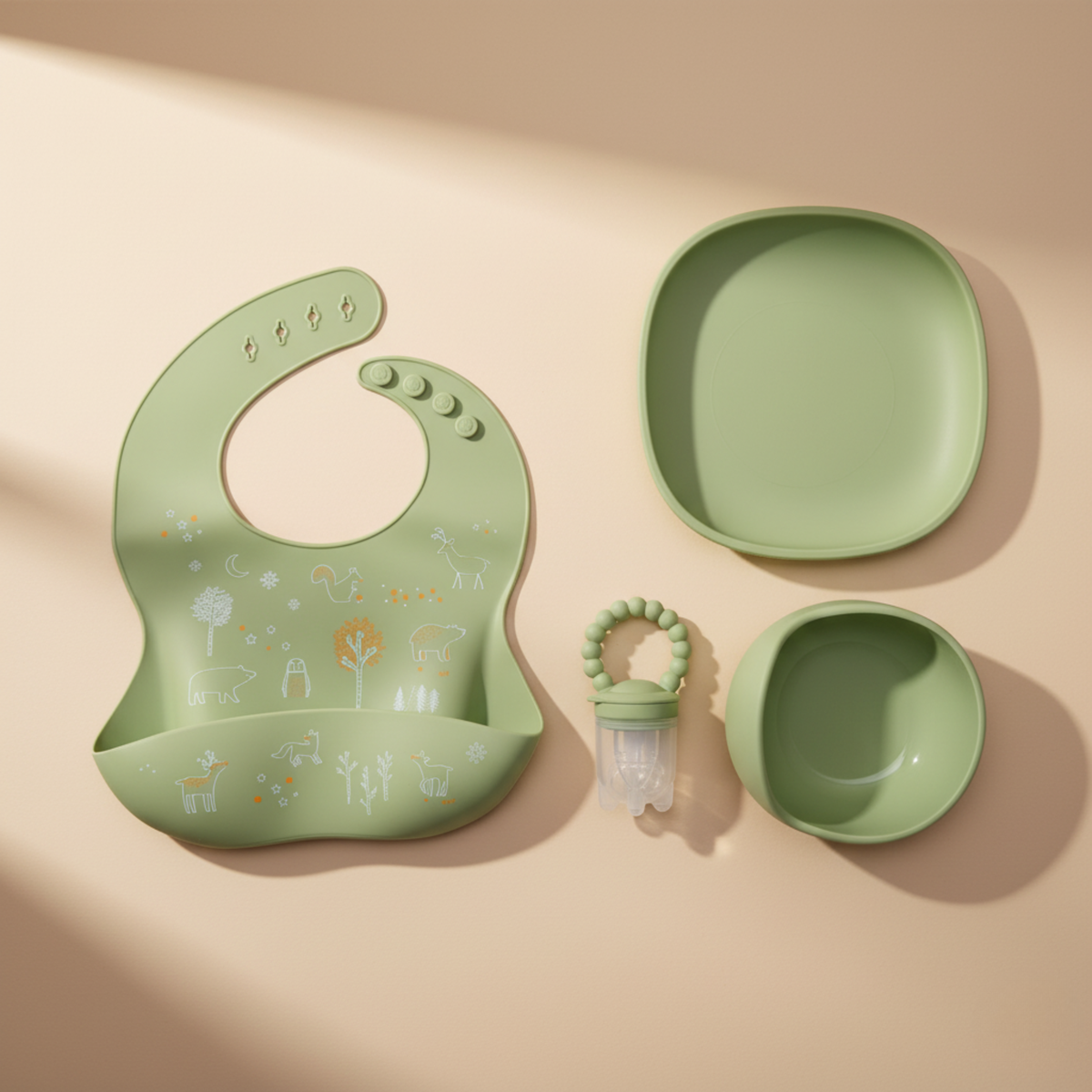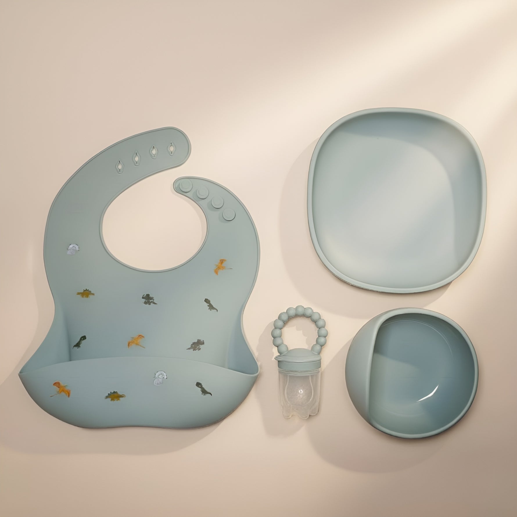 - Bib with Catcher: Features a soft, adjustable up to 4 sizes neckband and a large pouch to catch spills.