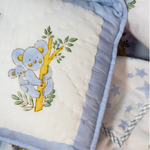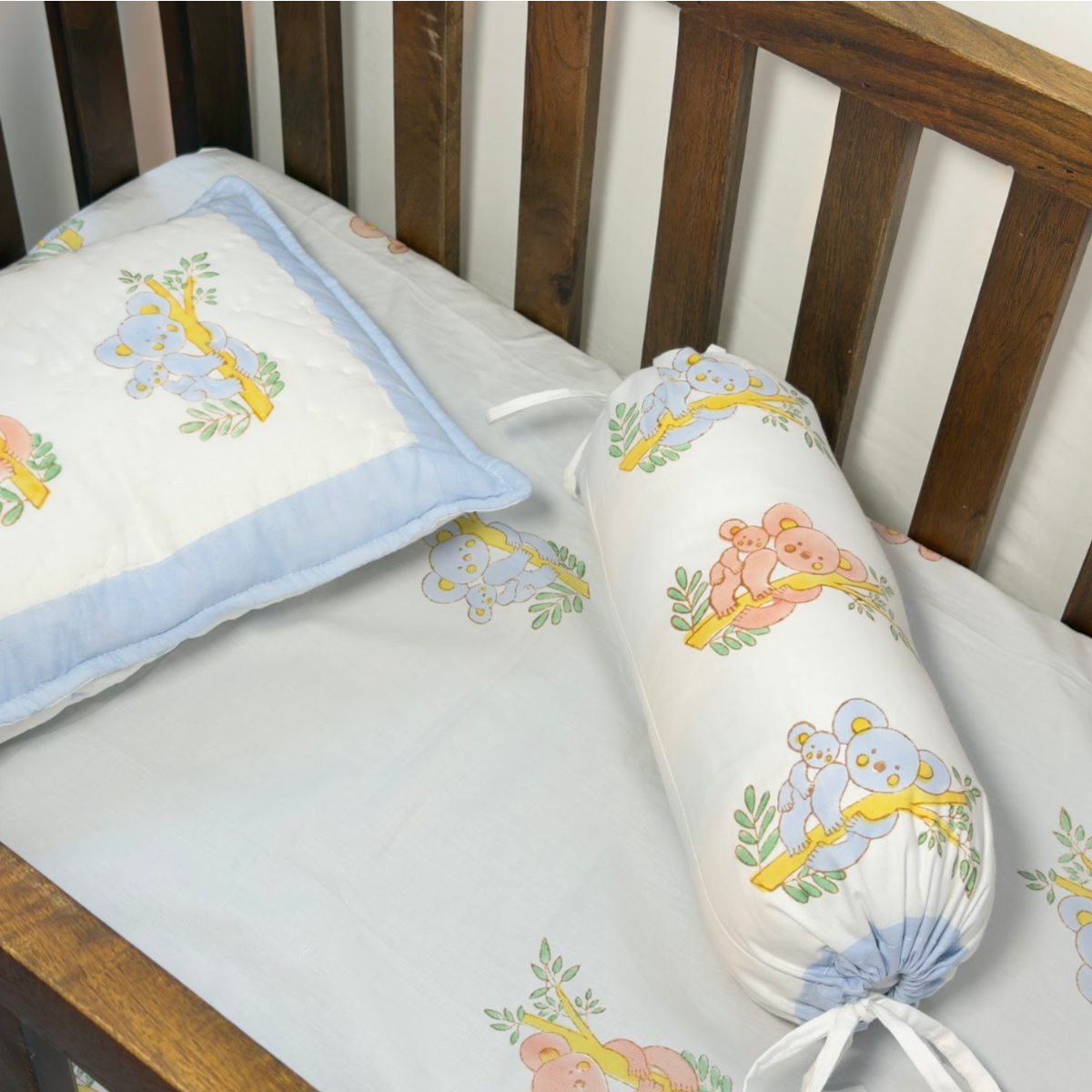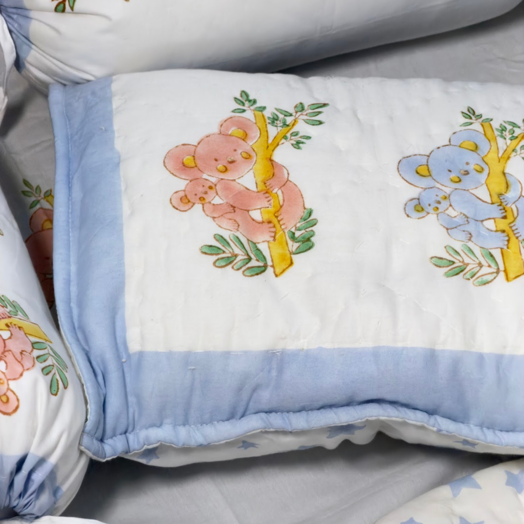 The collection contains everything you need to make your baby's nursery and cot a safe and soft snuggle space - bedsheet, pillow, bolster cushion, dohar and quilt.