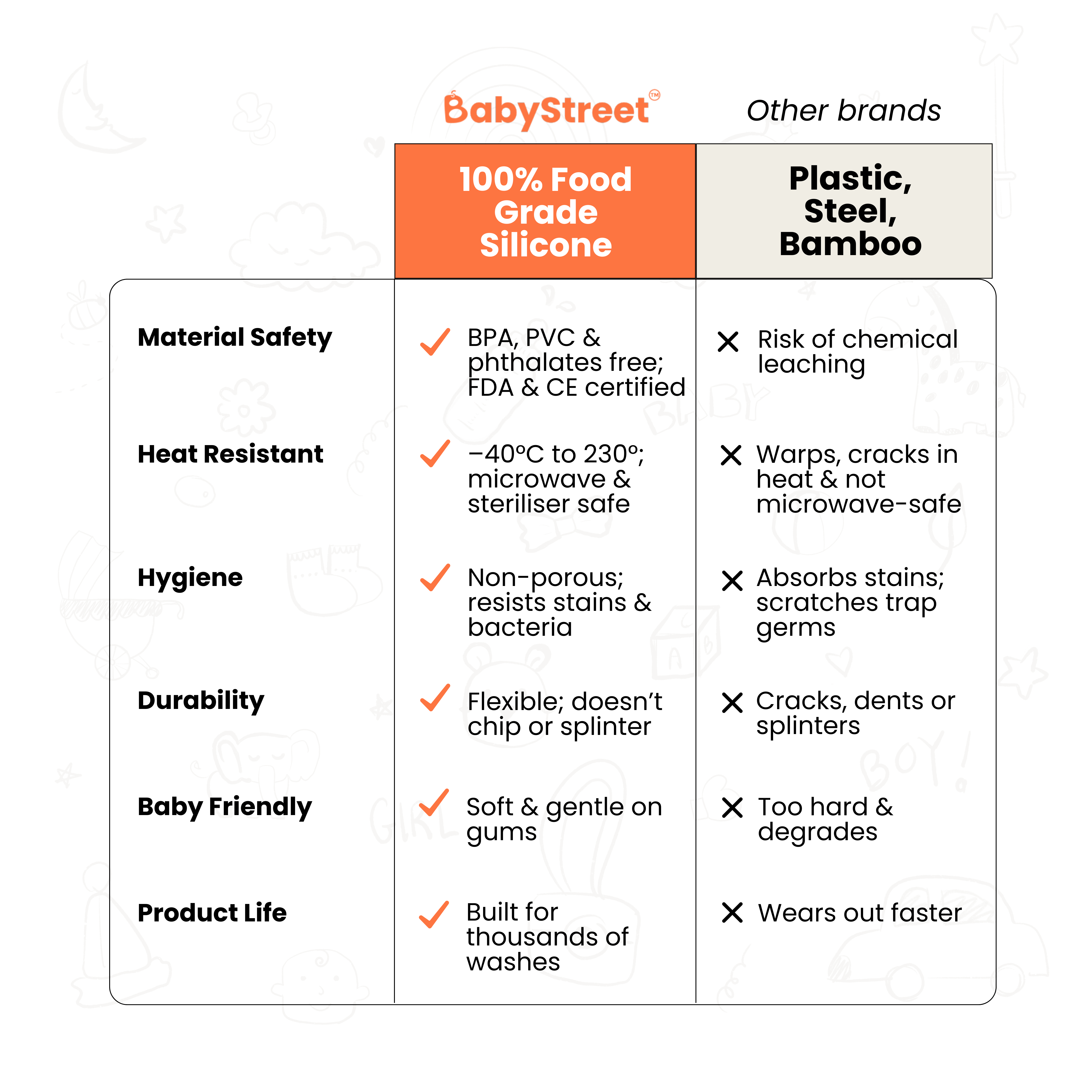 - Baby Safe: Made with FDA approved 100% Food Grade Silicone