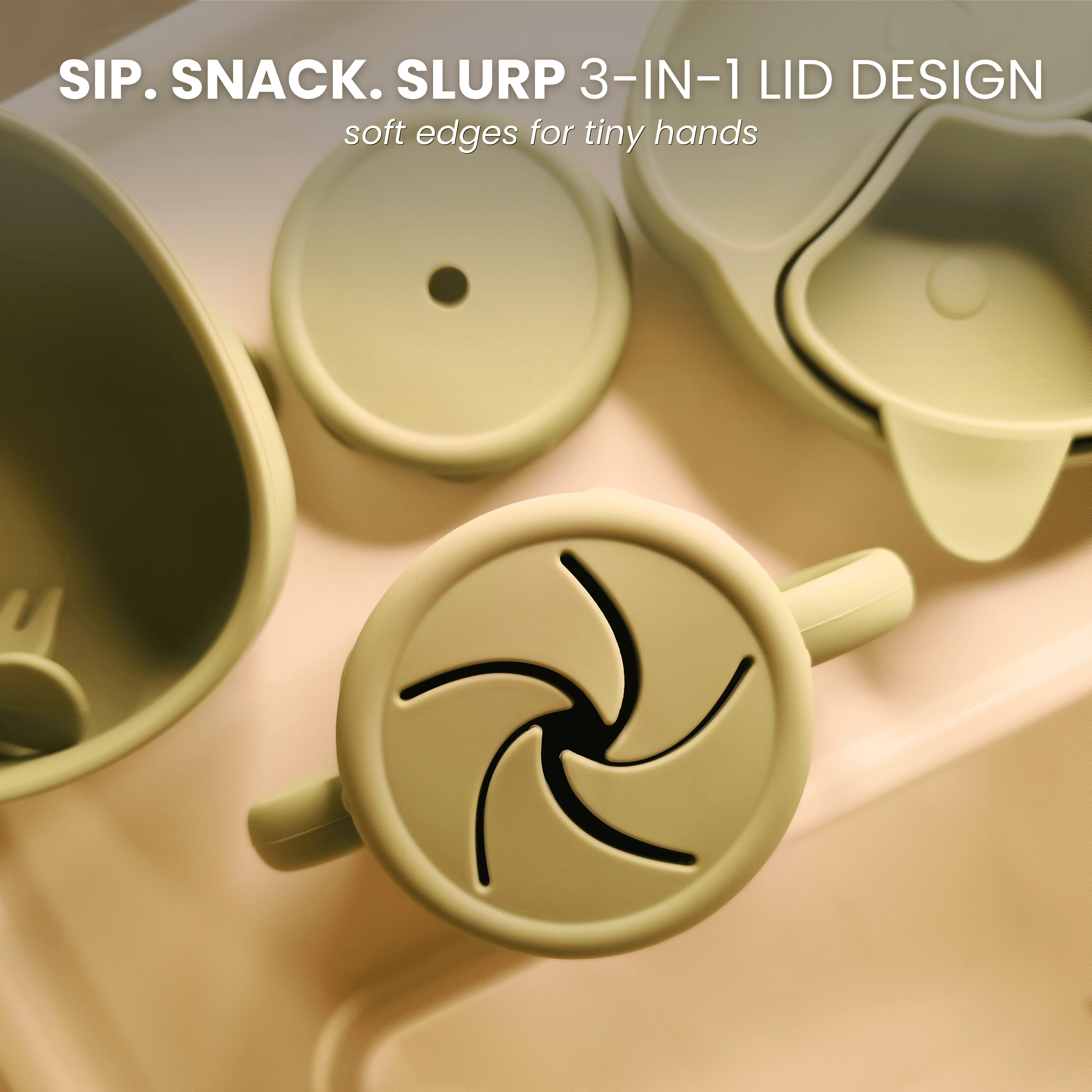 - Sippy Cup: 4-in-1 design grows from snack to sippy to straw to open as the self feeding grows.