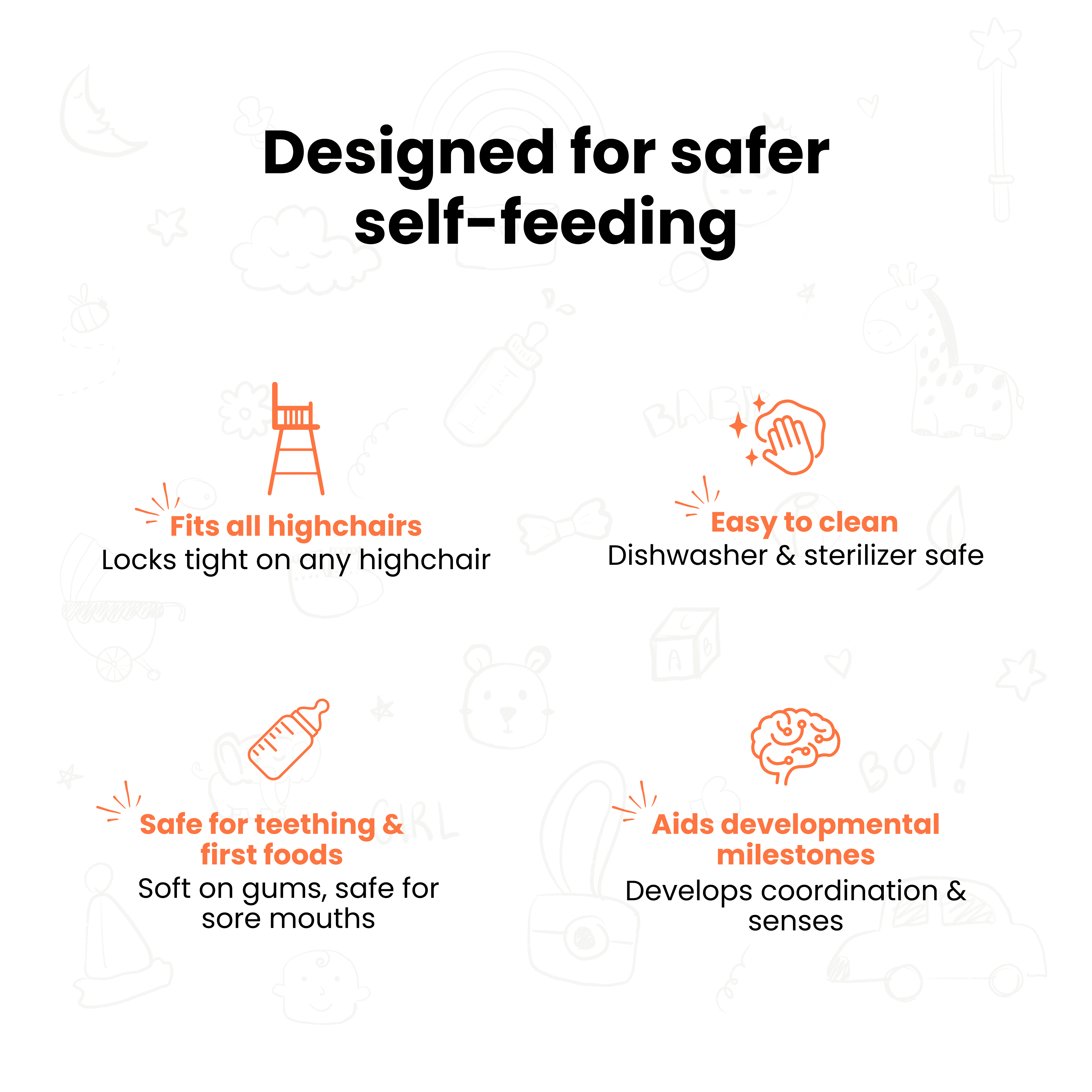 It provides a safe, durable and developmentally appropriate way to introduce solids and encourage self-feeding.