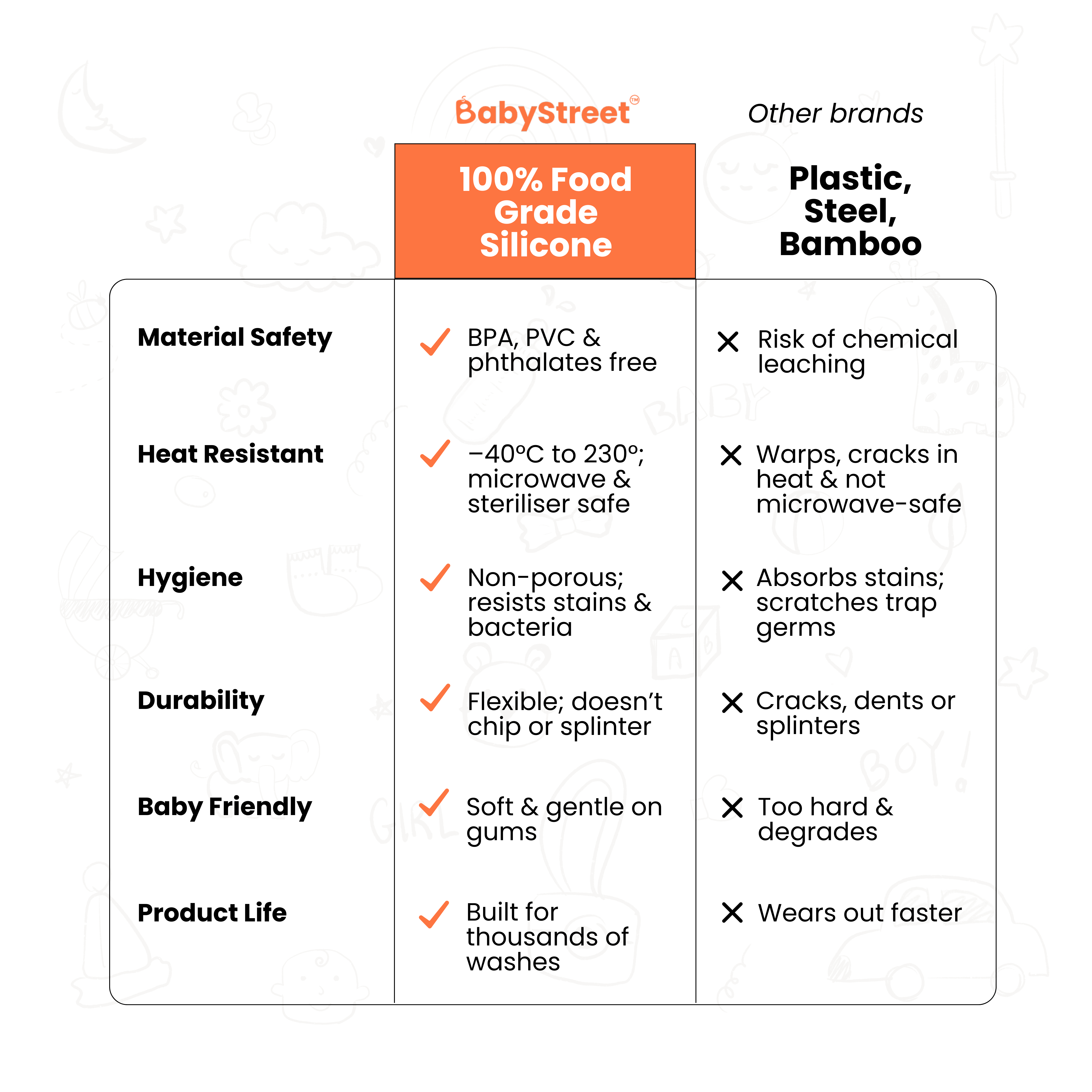 • Baby Safe: Made with FDA approved 100% Food Grade Silicone