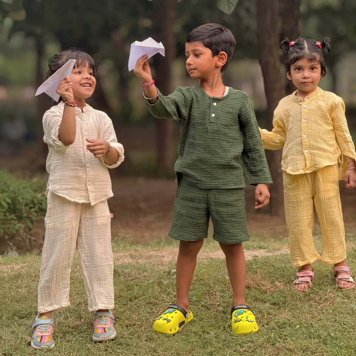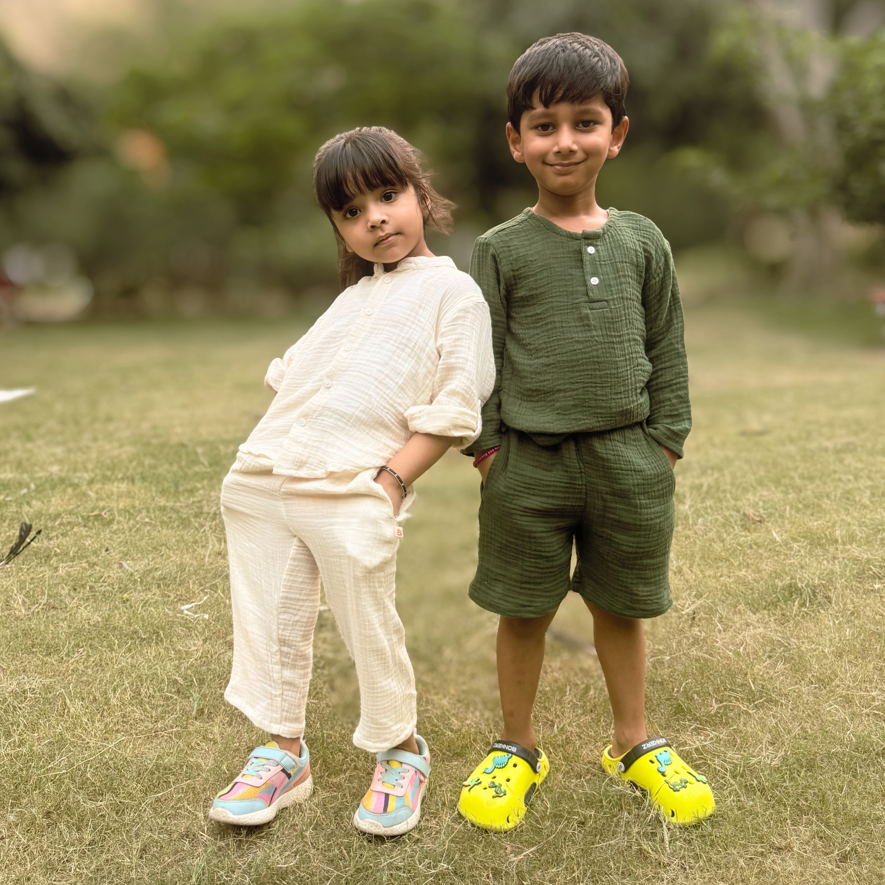 Smart classic unisex co-ord set comes with a shirt and pant combo, tailored slow like in a Atelier. Designed for year-round wear, it moves effortlessly through every season and setting—beachy summers, cozy winters, playful autumn days, relaxed lounge moments, or chic resort escapes.