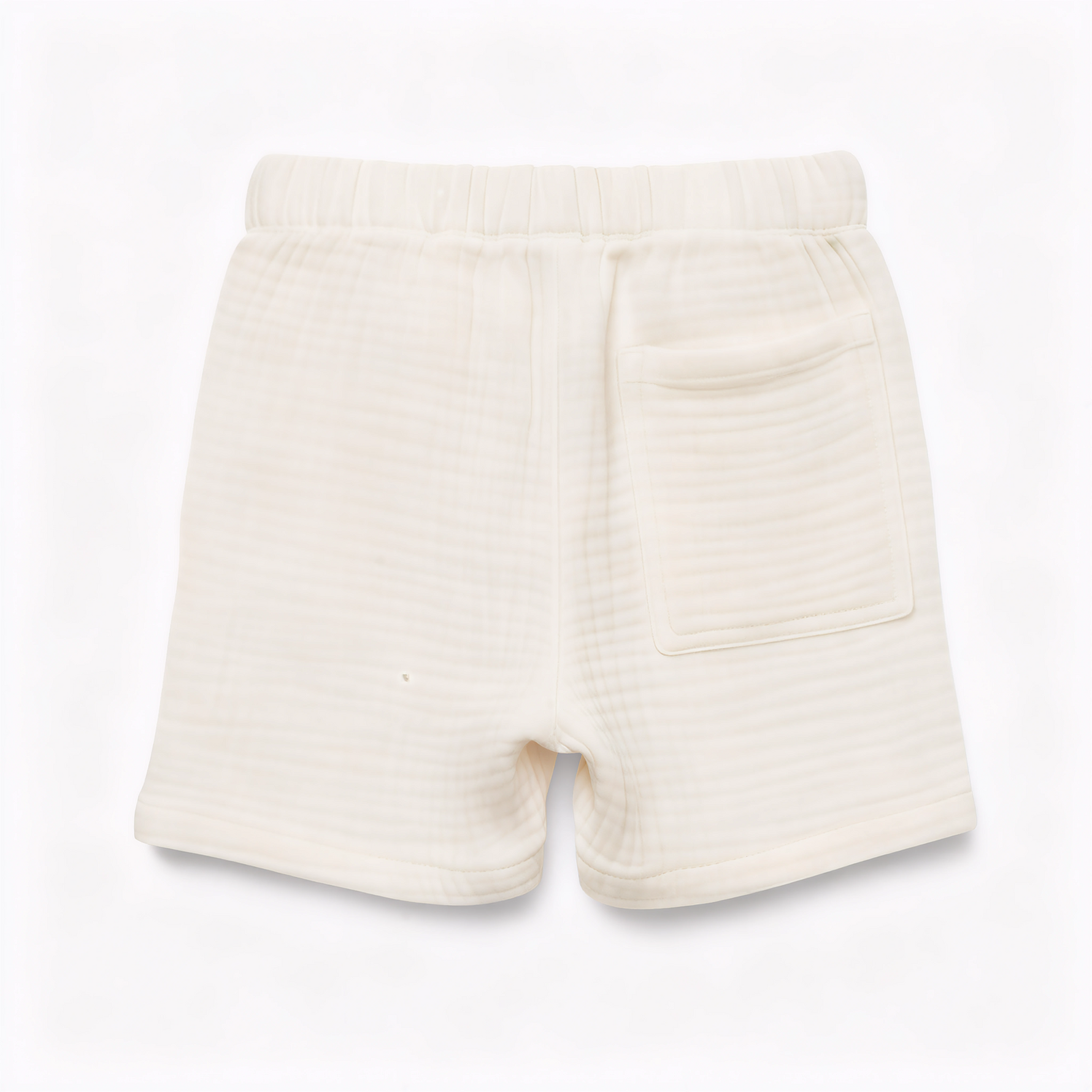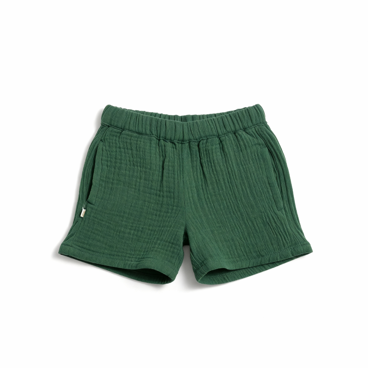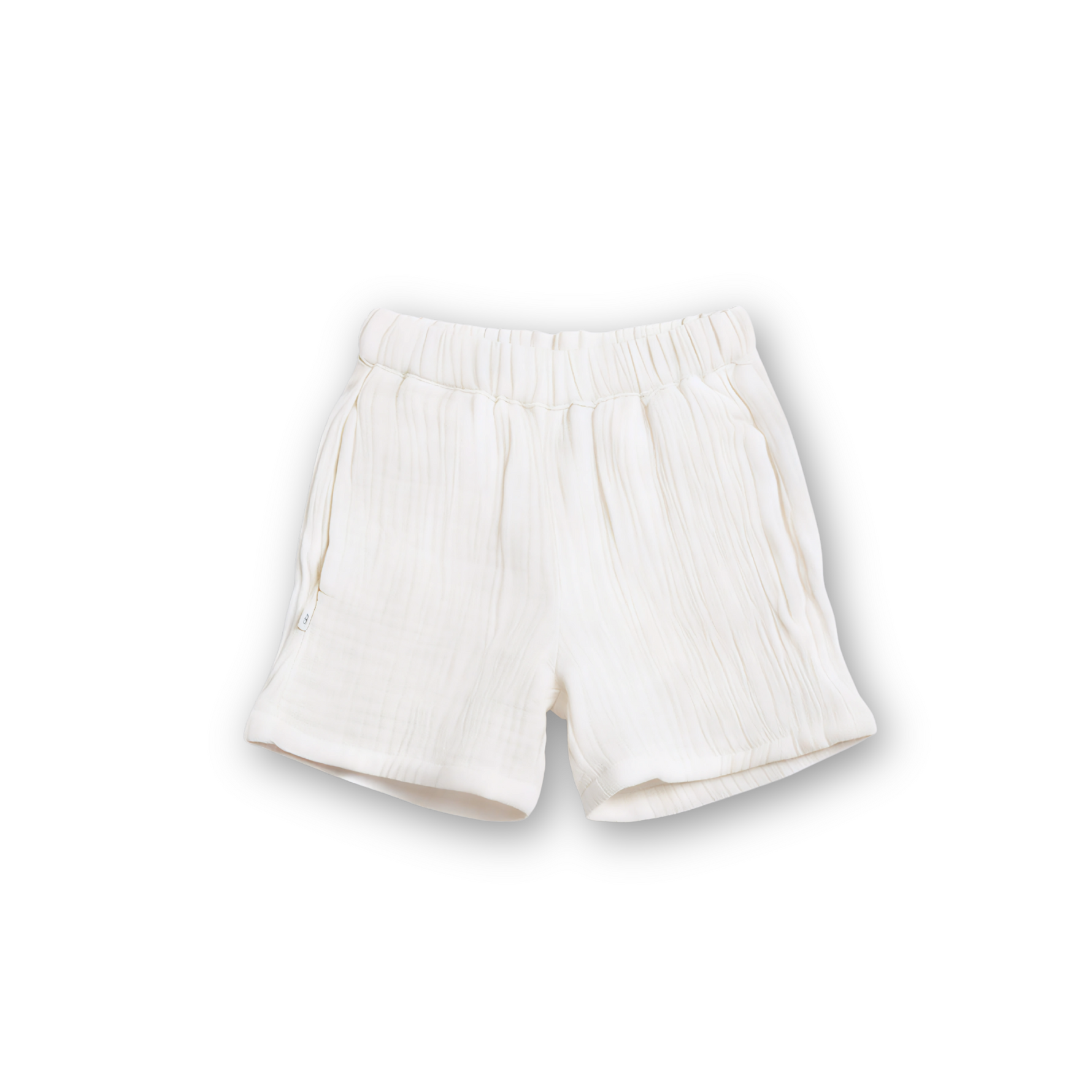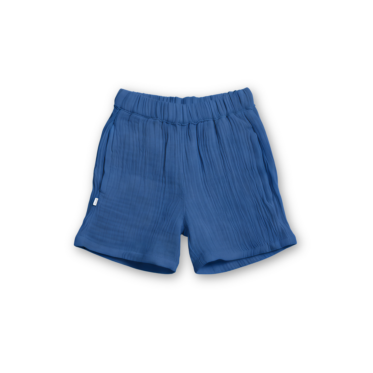 Comfort unisex shorts in soft cotton muslin. Regular fit with straight cut, elasticated waist, tailored side pockets and patch pocket at back. Designed for year-round wear, it moves effortlessly through every season and setting—beachy summers, cozy winters, playful autumn days, relaxed lounge moments, or chic resort escapes. The shorts get softer with each and every wash.