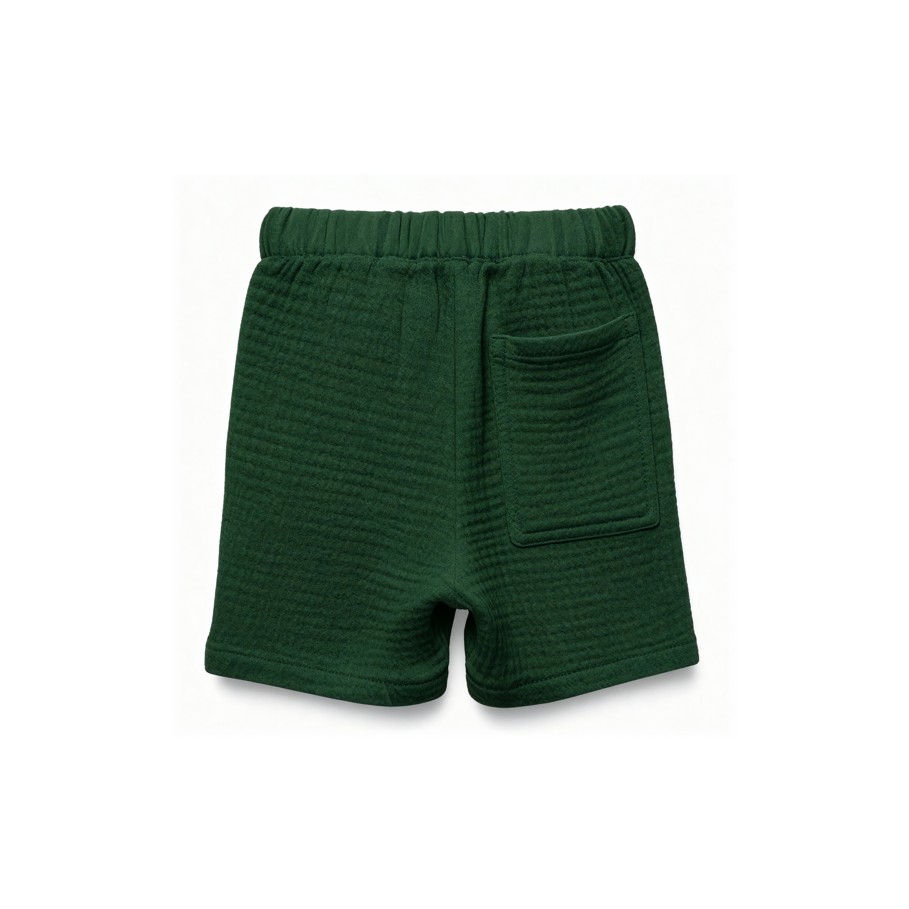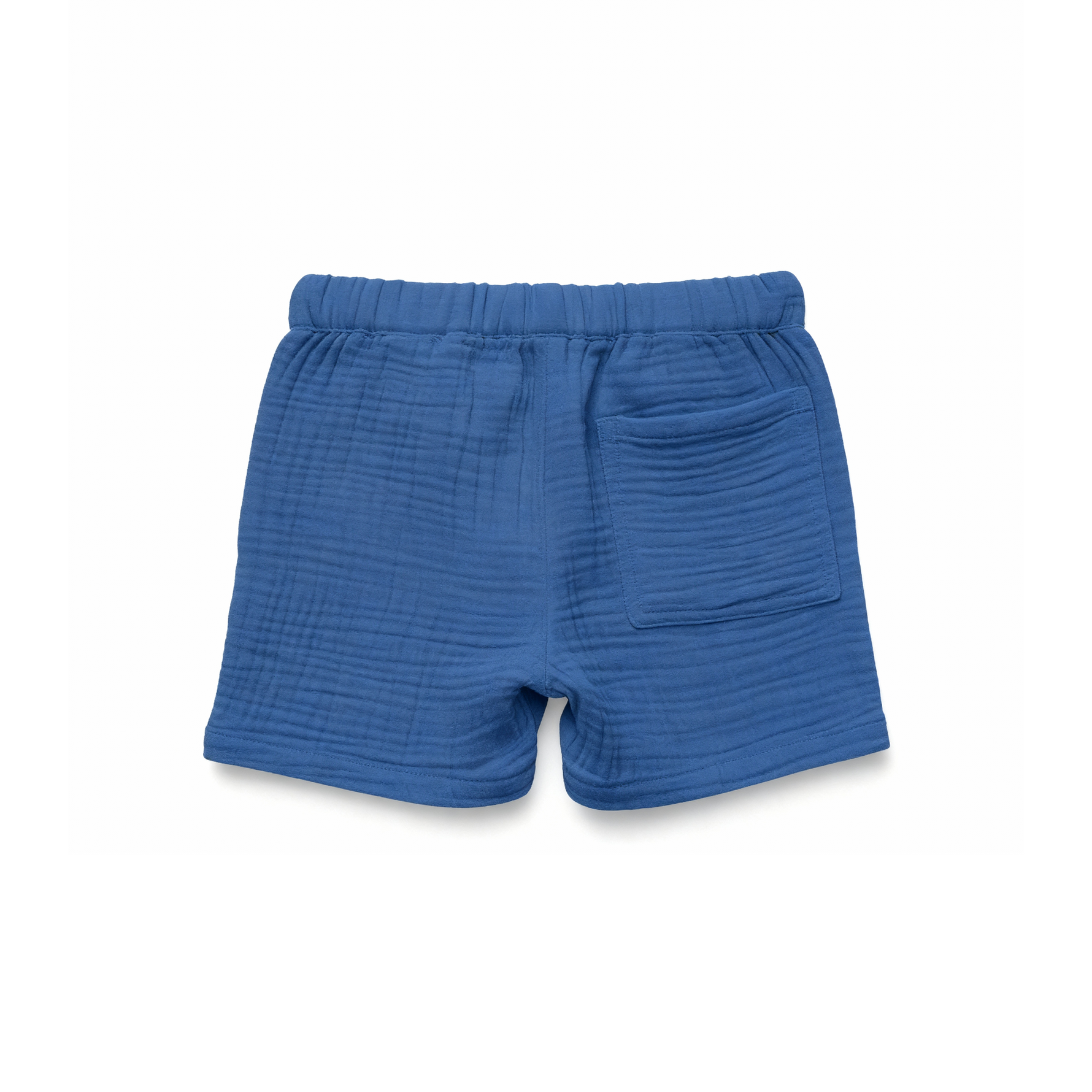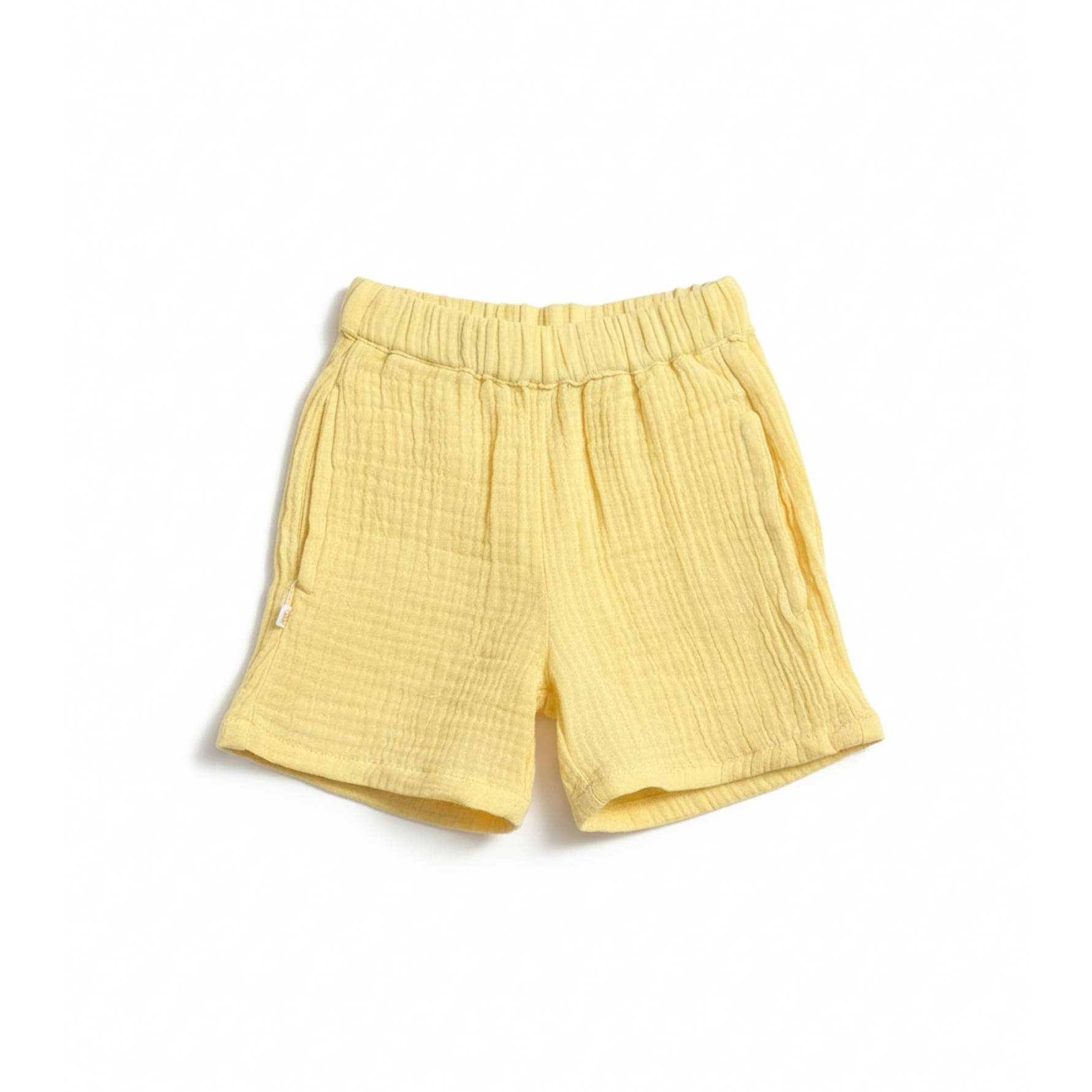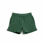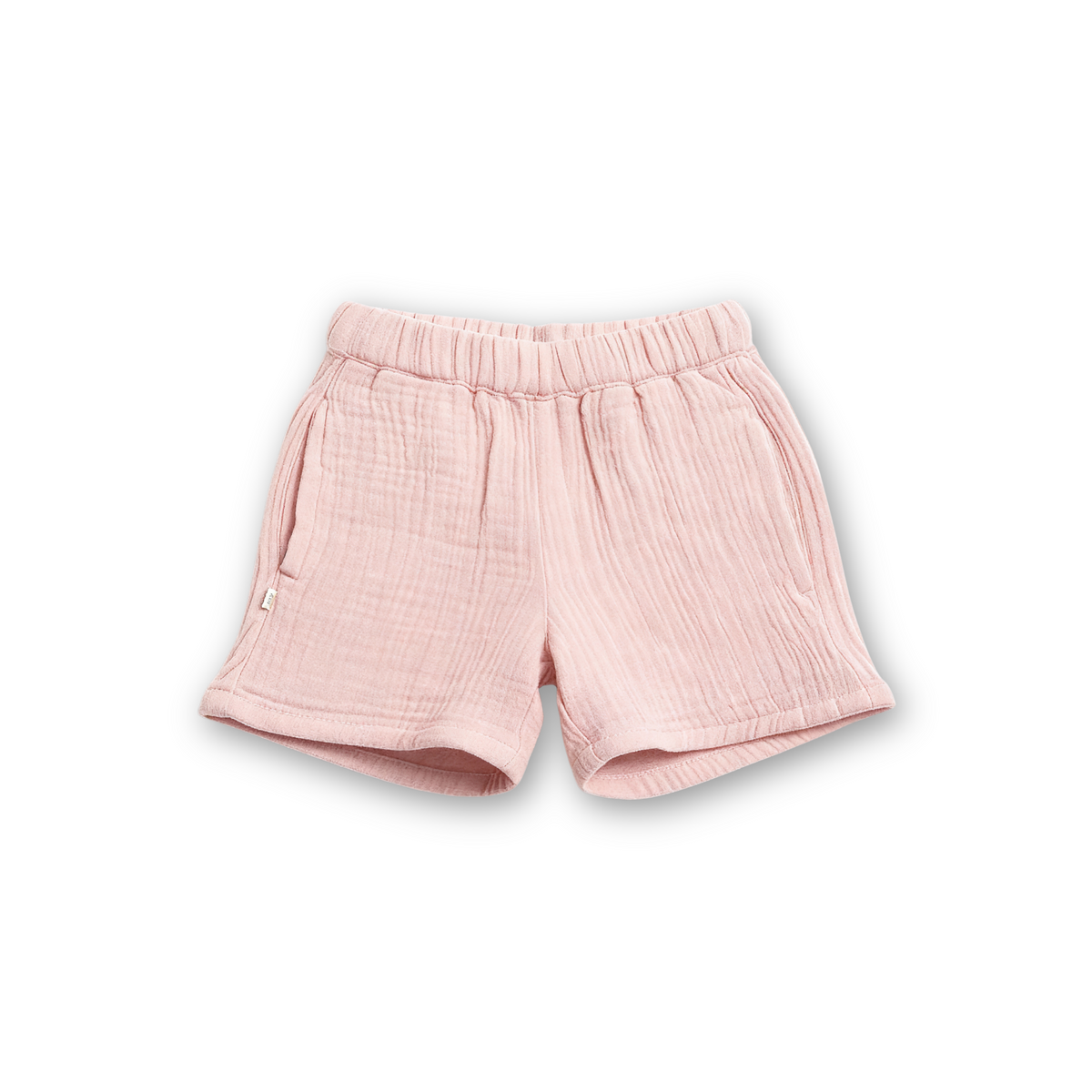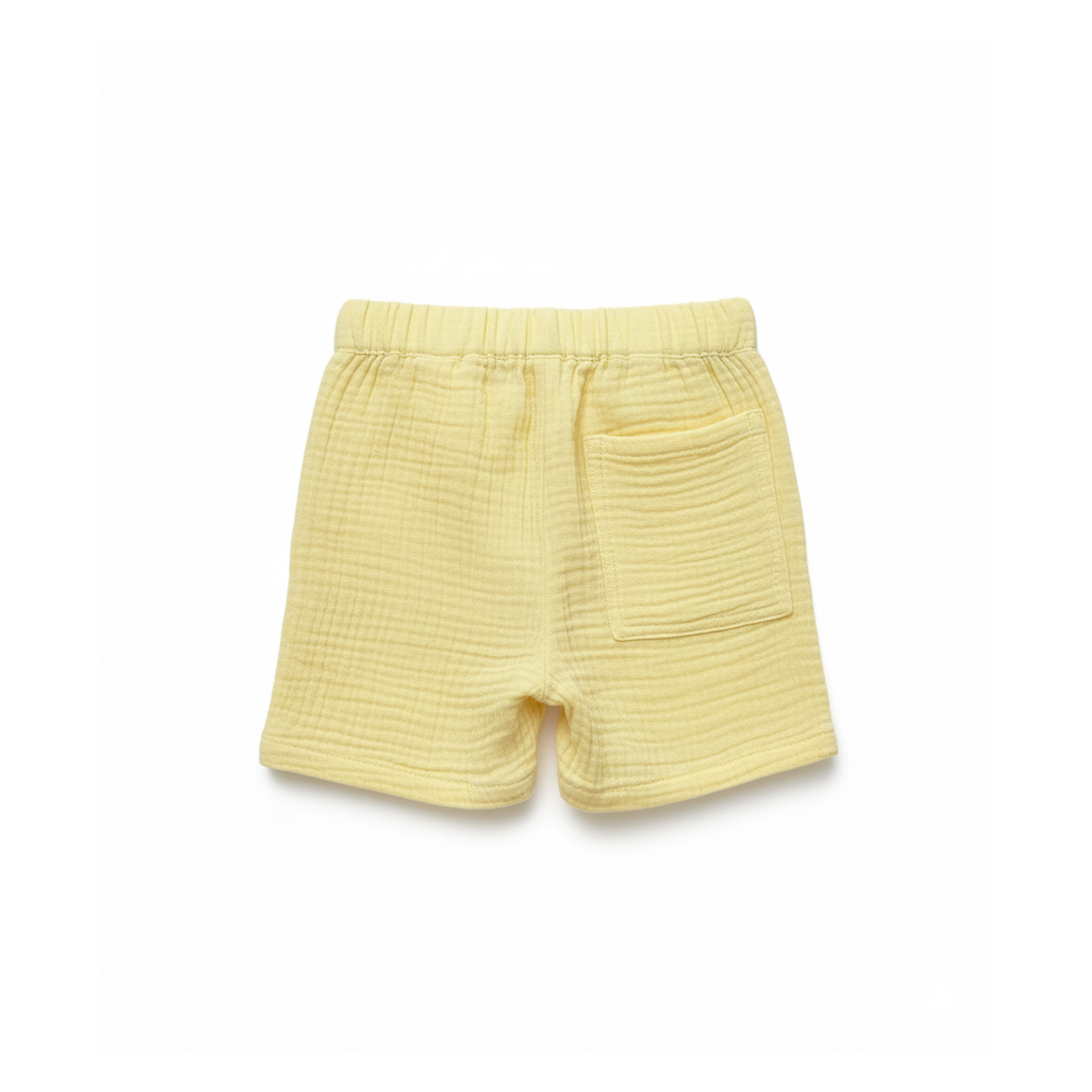 Comfort unisex shorts in soft cotton muslin. Regular fit with straight cut, elasticated waist, tailored side pockets and patch pocket at back. Designed for year-round wear, it moves effortlessly through every season and setting—beachy summers, cozy winters, playful autumn days, relaxed lounge moments, or chic resort escapes. The shorts get softer with each and every wash.