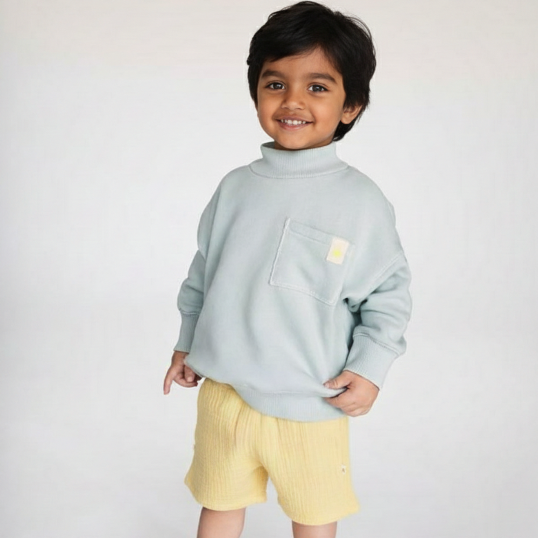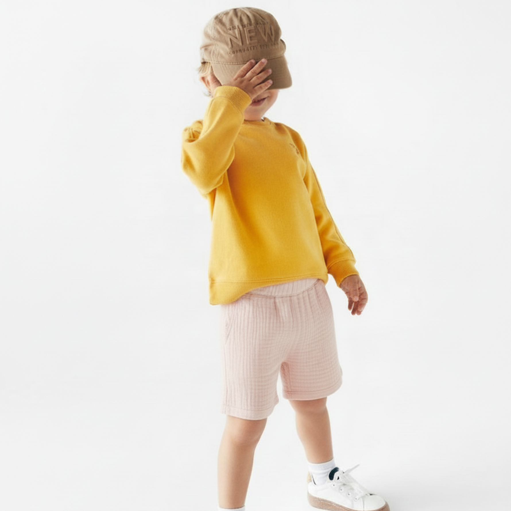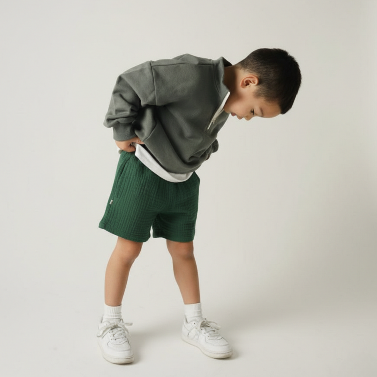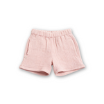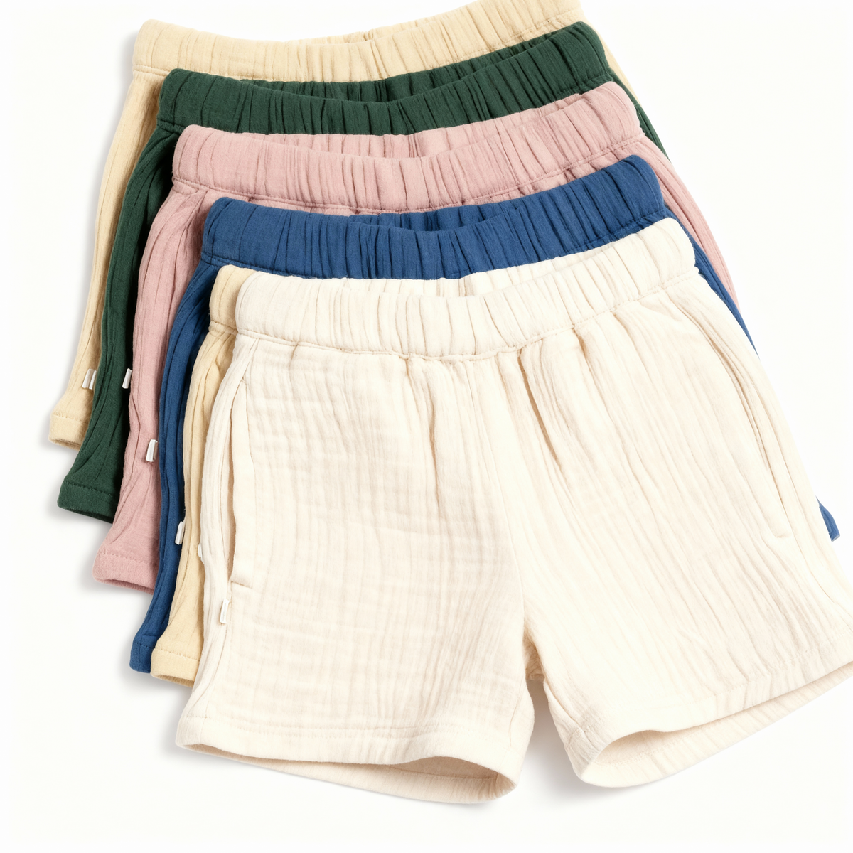 Comfort unisex shorts in soft cotton muslin. Regular fit with straight cut, elasticated waist, tailored side pockets and patch pocket at back. Designed for year-round wear, it moves effortlessly through every season and setting—beachy summers, cozy winters, playful autumn days, relaxed lounge moments, or chic resort escapes. The shorts get softer with each and every wash.
